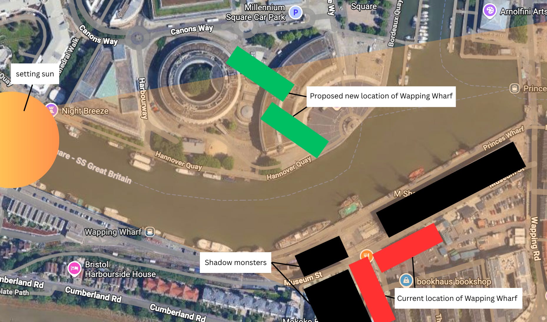 To me there are three obvious solutions to this problem. Number one — we simply pick up the shipping containers and dump them on the other side, where they really belong. This is the best thing that could be done for the food lovers of Bristol. Shipping containers are literally designed to be picked up and moved. We must take advantage of this. We were planning on moving them anyway, weren’t we? This is a far more logical set up. We’d have to demolish both the Lloyds’ buildings, but that’s no great loss. The Lloyds people can move into Wapping Wharf (or, indeed, anywhere else) and us restaurant goers can enjoy the setting sun over the water alongside our umami bomb from freshly-relocated Bertha’s, the best pizza in Bristol now within stumbling distance of Watershed.