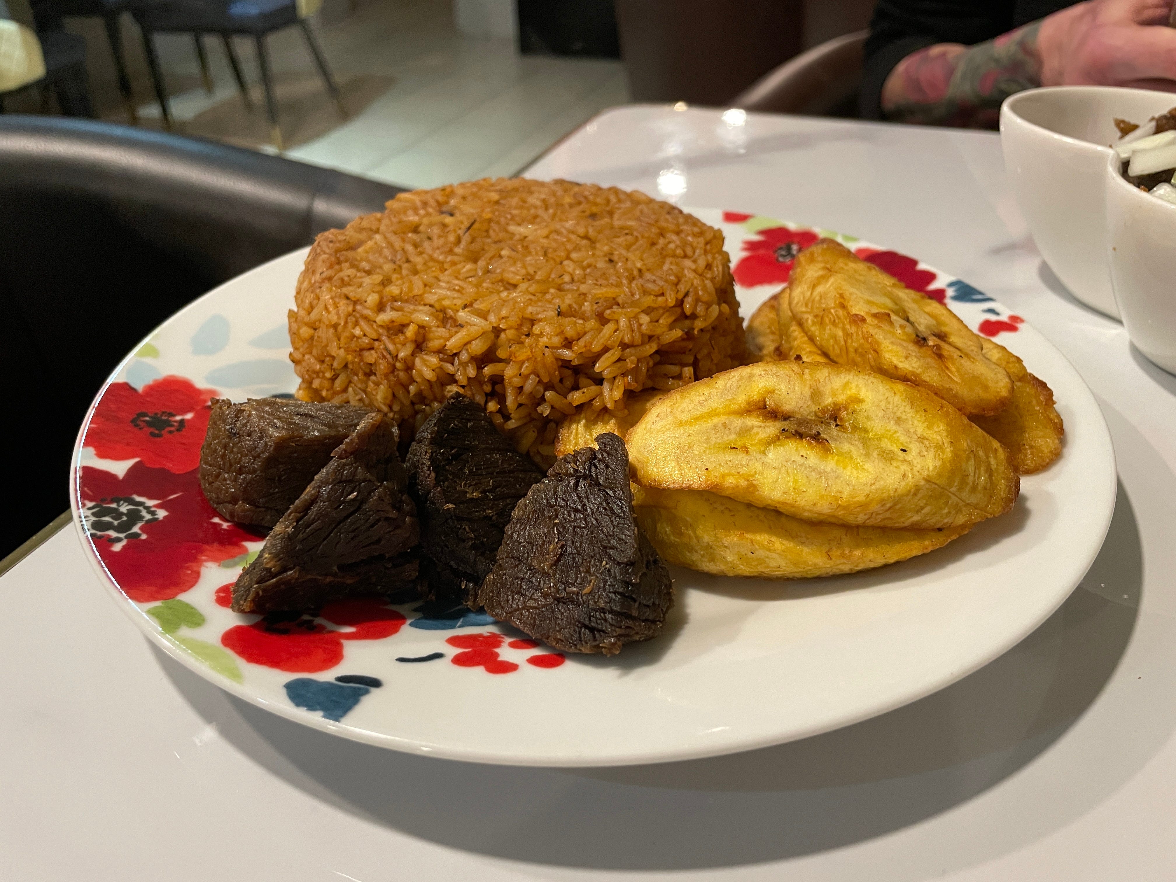 We order jollof rice with grilled beef, because they didn’t have fried chicken (£10), a side of plantain (£5), goat suya (£15), poundo with egusi soup and beef (£10) and two bottles of water (£2). We strongly considered isewu (£20), which is a whole spicy goats head, but decided against it as we had already eaten in one other restaurant that evening (a story for another time) and weren’t hungry enough.