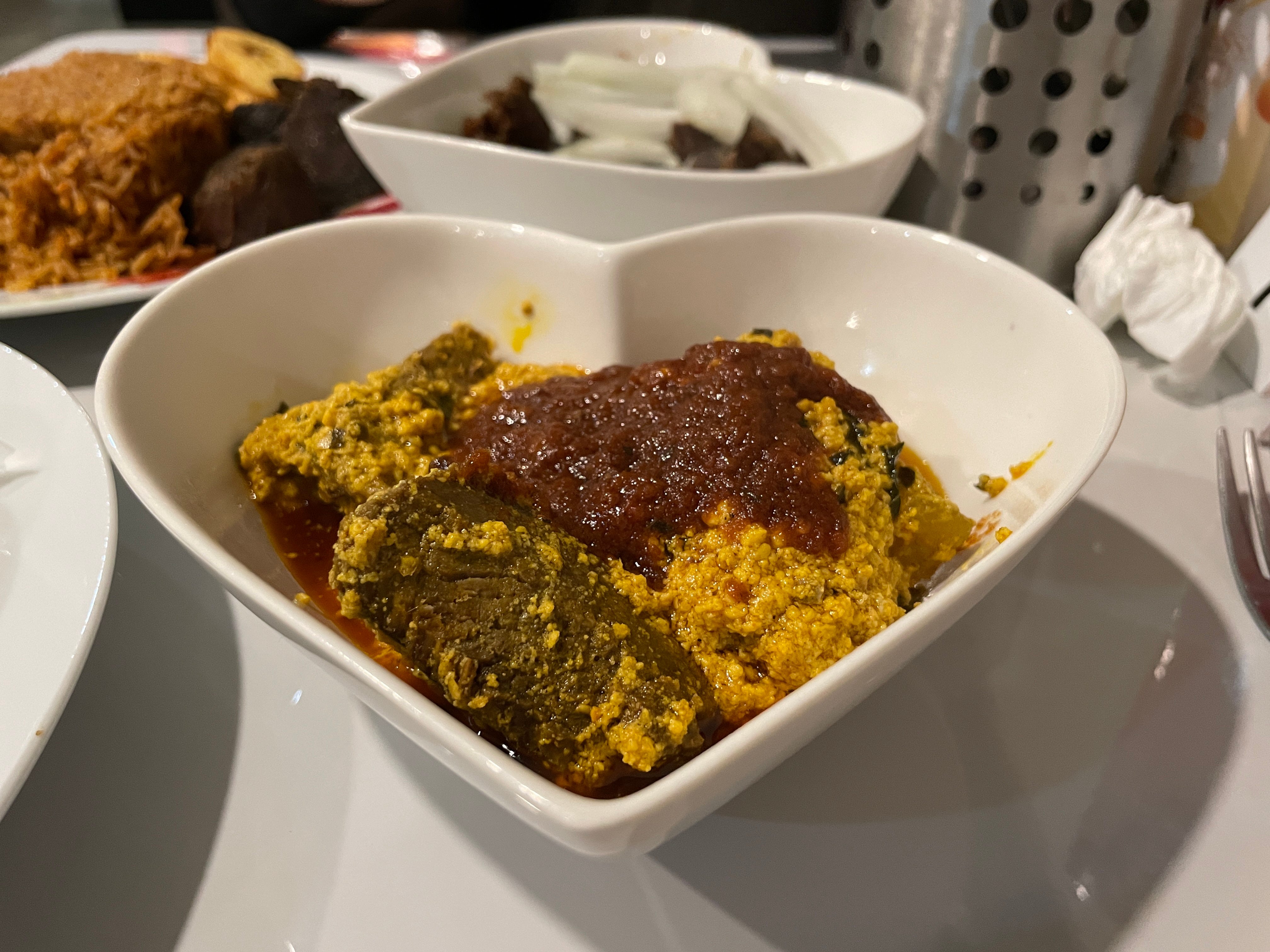 Our final dish boots me completely out of my comfort zone but in the best possible way. Egusi is referred to as a soup but it’s thick with beef, more like a stew. It’s made of ground melon seeds, which form a fiercely bitter paste that is swimming in palm oil. It doesn’t sound all that nice, and in some ways it’s not, but it is so alien to my palette that my curiosity is set aflame. So rare is it to find something so far away from what I know.