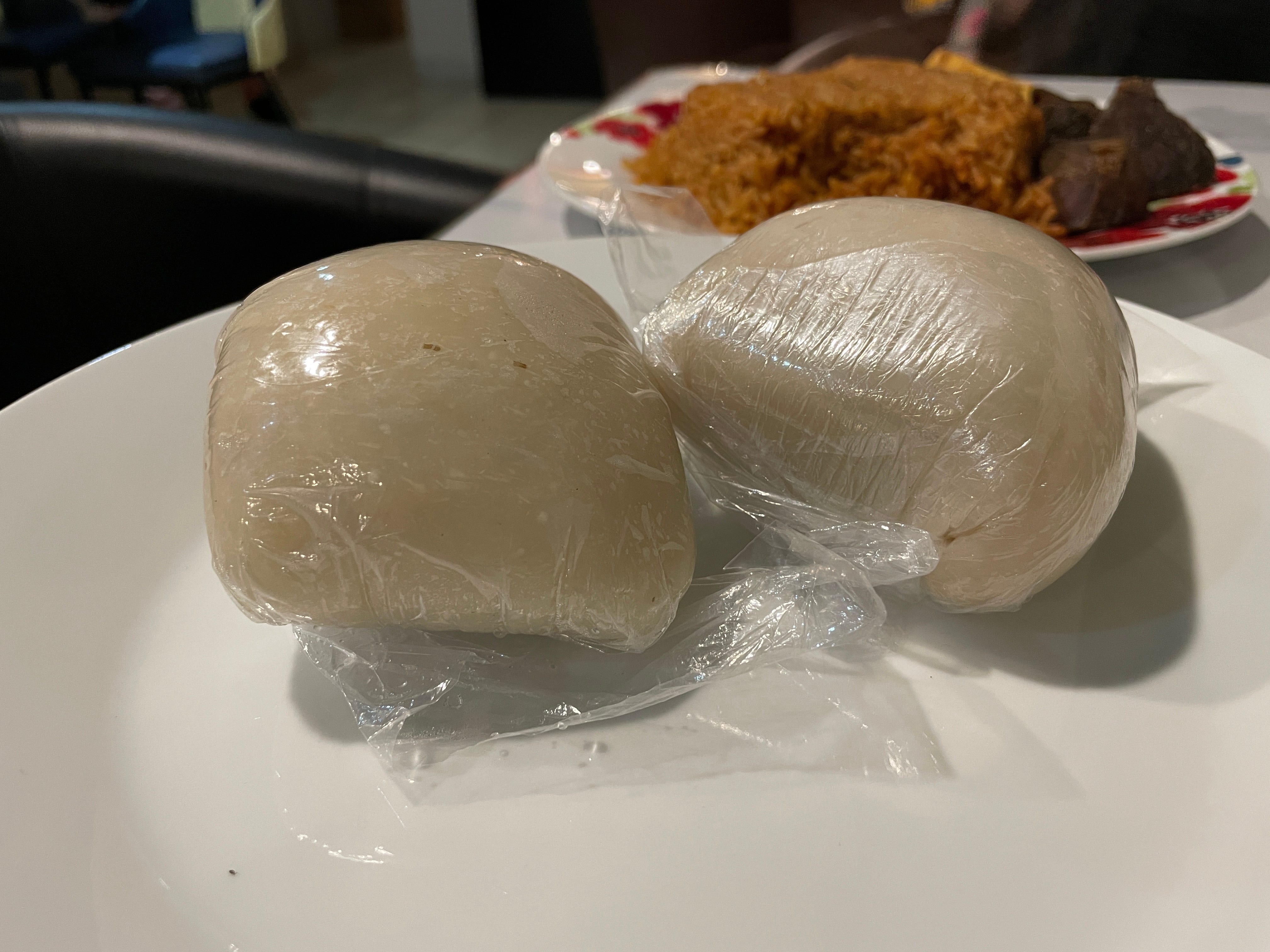 It’s served with poundo, a cling wrapped package of starch intended for dipping. Alarmingly similar to play-dough, it’s made from pounded yam. Again, I don’t love it, and wouldn’t choose it over bread for dipping, but the experience is enthralling.
