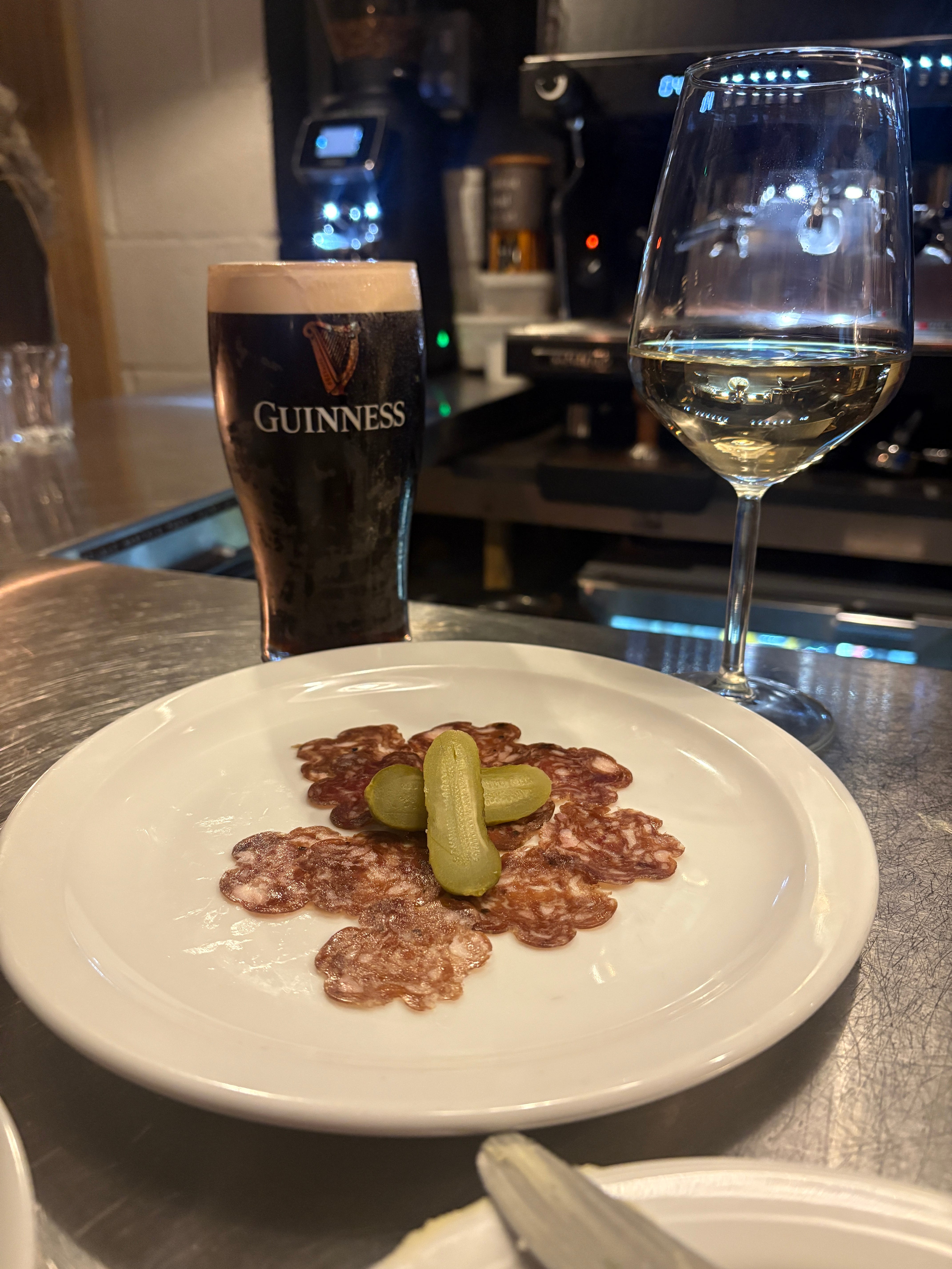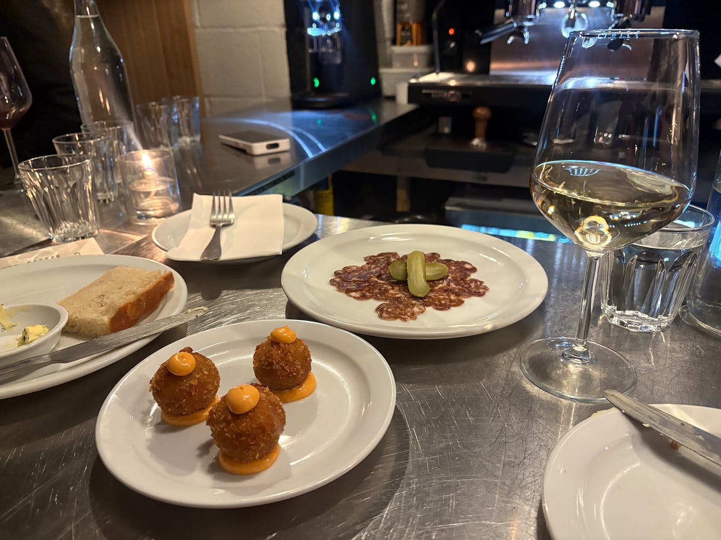 This time the concise menu was bolstered by a few bonus pickings from the mothership. From a short blackboard offering of three charcuterie and two cheeses, alongside the classic 2026 wine bar signifiers of almonds, olives, padron peppers and tinned fish (smoked sardines currently), it was the truffle salchichon bellota that appealed over the plain version or lomo.