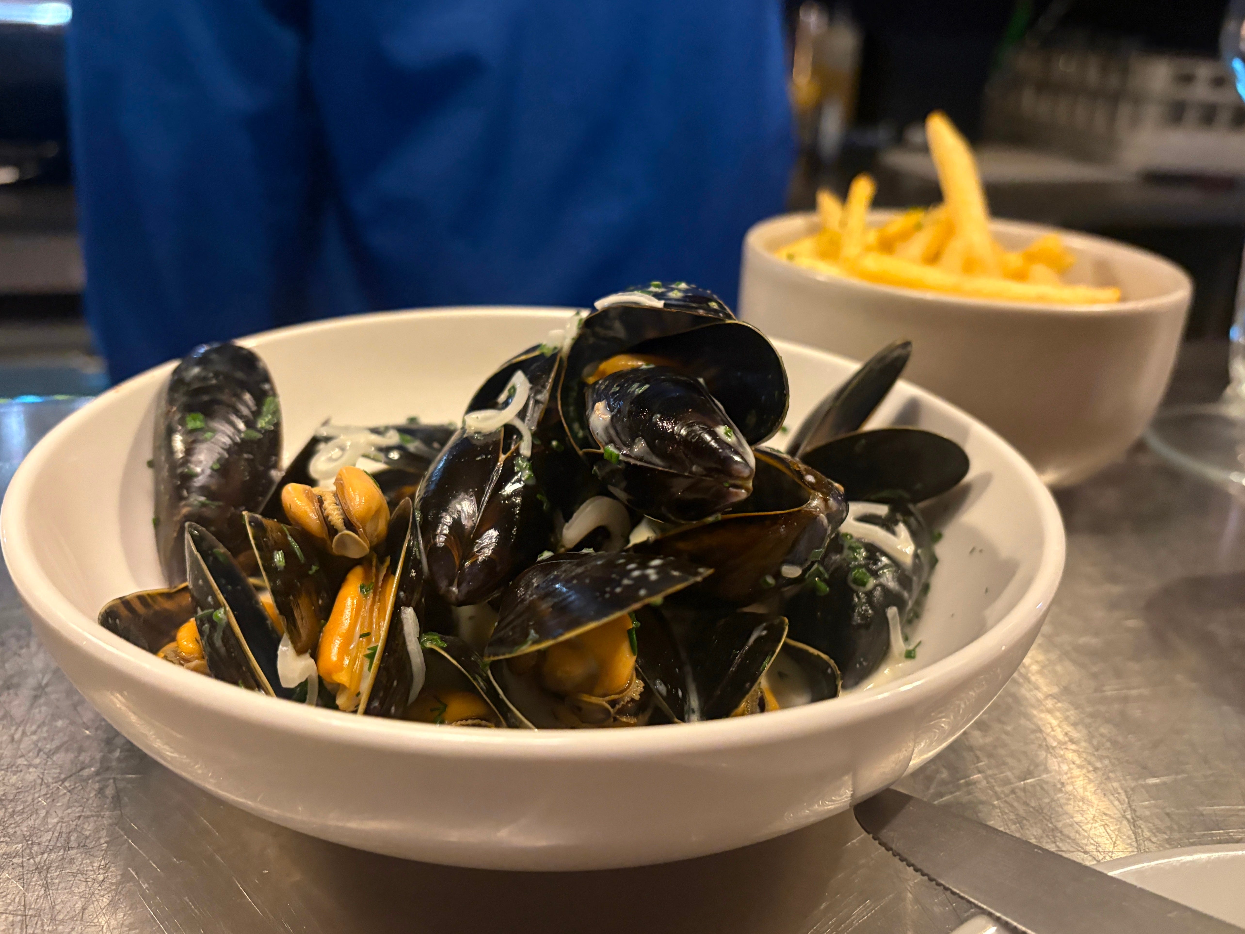 Luckily, I had assigned a slice of focaccia to keep aside for my friend at the start of the meal, because I am very kind. When, over an hour in, she still hadn’t finished it, I took it upon myself to reclaim it for dunking it in the creamy shellfish-infused broth at the bottom of a bowl rattling with shiny, plump bivalves (£13 with fries). The fries could have done with both more salt and more time in the fryer, although they remained admirably crisp despite their blondeness.