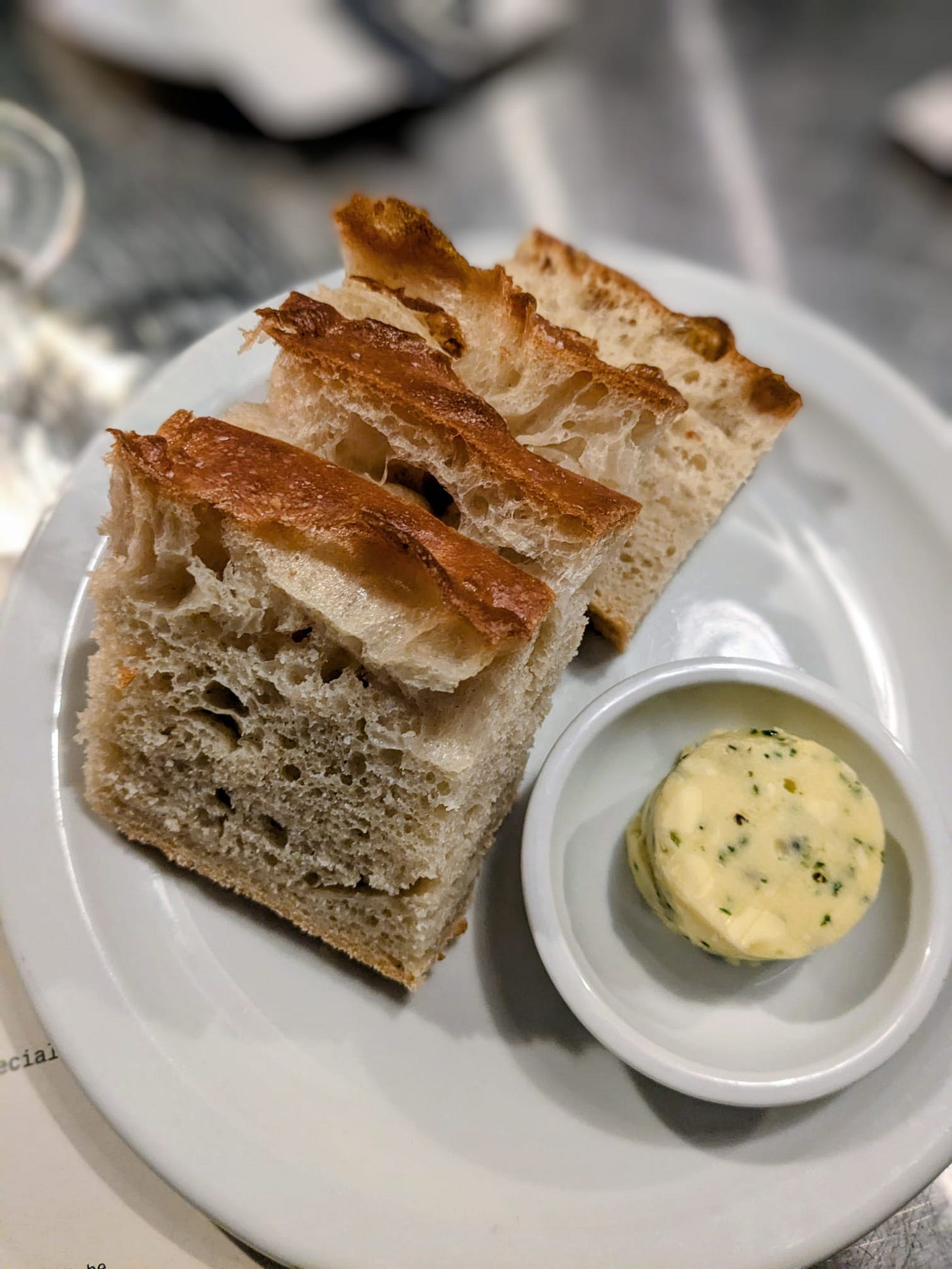 Four thick wedges of irregularly-bubbled focaccia (£4.50) soon made their way over. If I wanted to be querulous — and lord knows I generally do, even if Carmen Street is the sort of place that makes it easy to forget any niggles — I’d have liked more than the one puck of caper-riddled beurre ravigote provided. But you could give me a whole pack of butter and I’d still wonder whether that was quite enough, and maybe it was a deliberate ploy on behalf of our server to ensure we had enough bread left for the forthcoming mariniere sauce. If I was that good at delaying gratification, I probably wouldn’t be divorced. Meg said she wished she’d saved some bread and butter to make herself a chip butty (you can take the food writer out of the north…) to then dip into the sauce. That’s another level again.