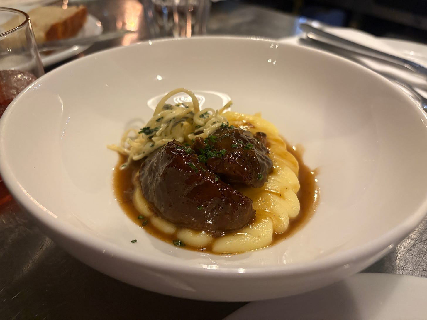 In quick succession came an off-menu treat presumably ferried in sneakily from Caper: pig’s cheek (£14), slow-cooked to a seductive, softly-sweet nugget, with some of the best, most silken pommes purée you’re likely to come across the side of the Bayeux tapestry. Winter-comfort-food-par excellence, but a snappy celeriac remoulade made sure it coddled rather than anaesthetised.