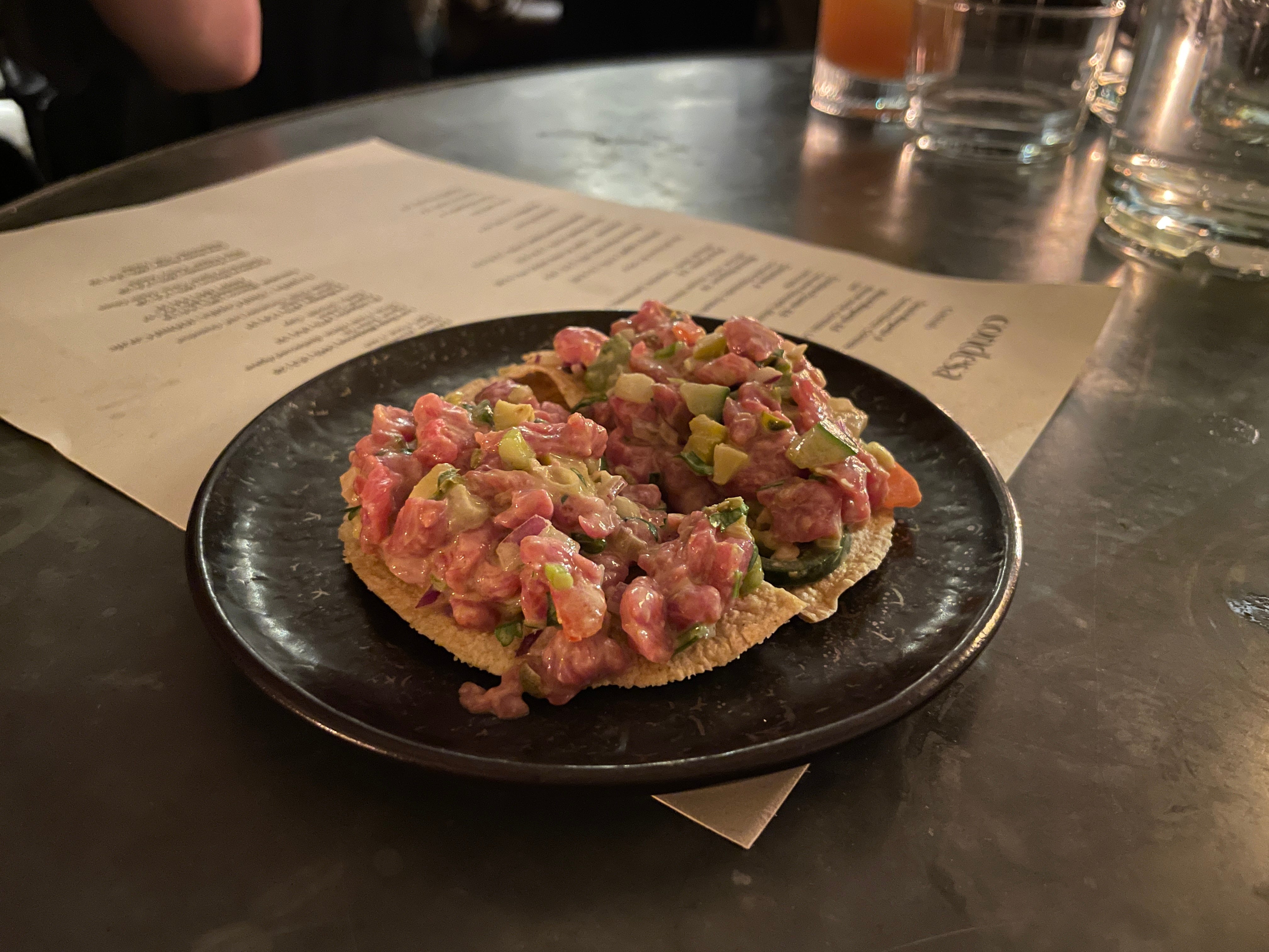 I always appreciate it when a member of staff tells you their favourite dishes. There’s nothing worse than asking and hearing ‘oh it’s all delicious’. That means they haven’t tried it, which means the restaurant doesn’t give a toss that their staff are serving dishes they don’t know or understand. Not here - she was spot on. The tartare tostada reminds me of the ones I ate at La Guerrerense in Mexico City; a favourite of the late Anthony Bourdain for good reason. The research trips have paid off in that dish alone.