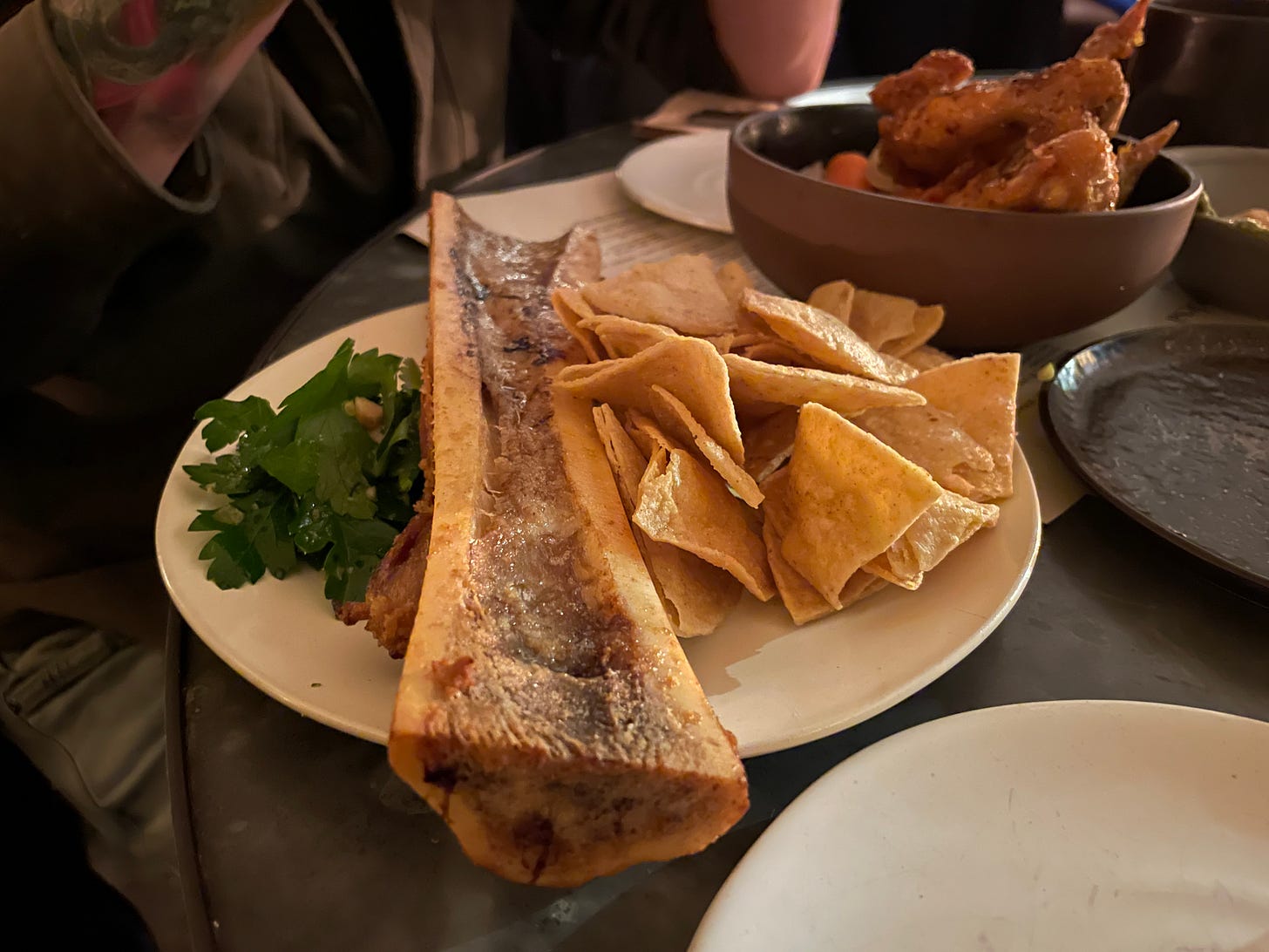 Also memorable are the fried chicken wings (£7.5) - it’s hard to beat a fried chicken wing - and the trout ceviche with grapes (£9.5). The trout has been swimming in the citrus just a little too long and doesn’t have that just-opaque quality that defines an outstanding ceviche, but the grapes are an ingenious burst of sugar and the overall composition is pleasantly piquant, especially when piled onto some of the tortilla chips that are surplus to the equally good bone marrow dish (£8).