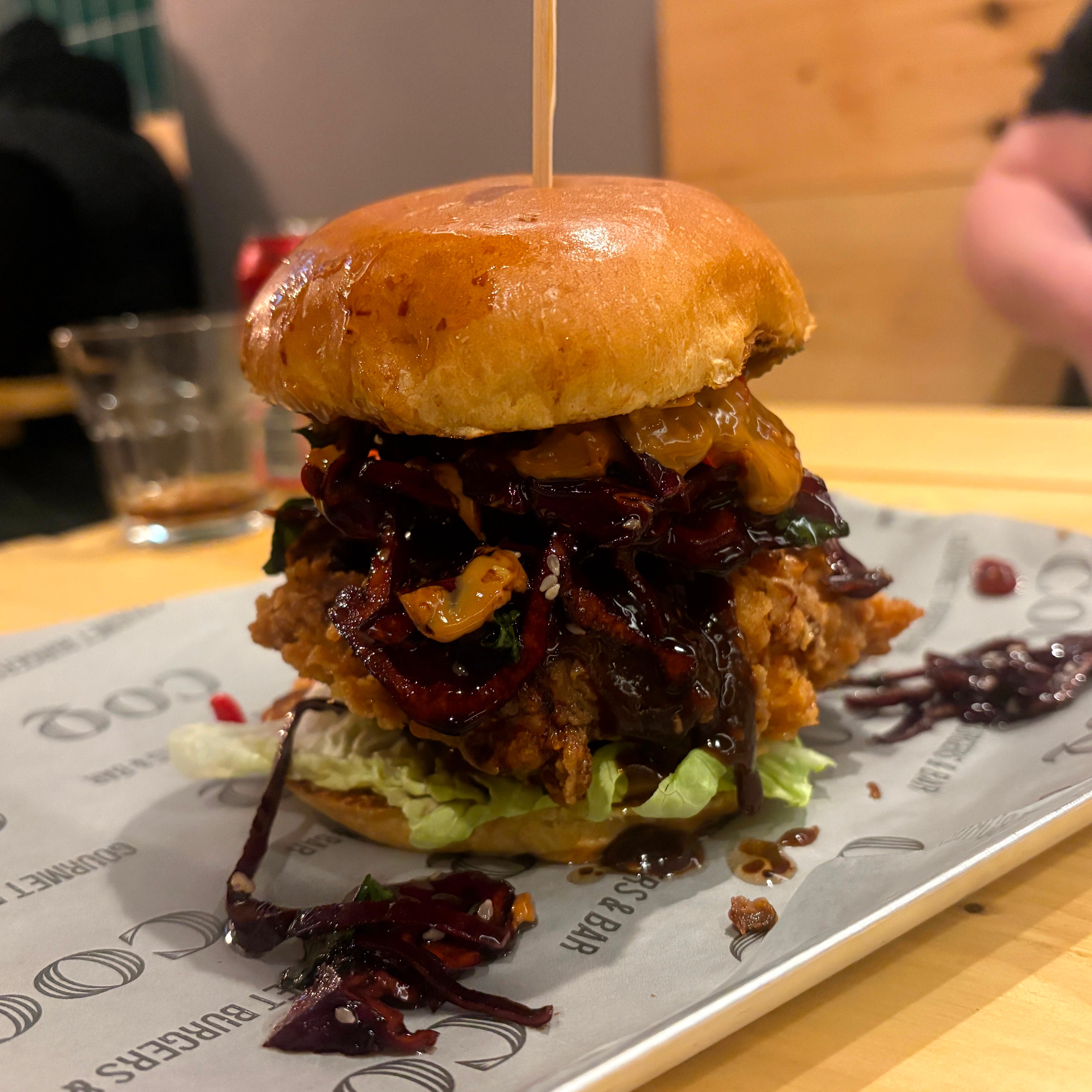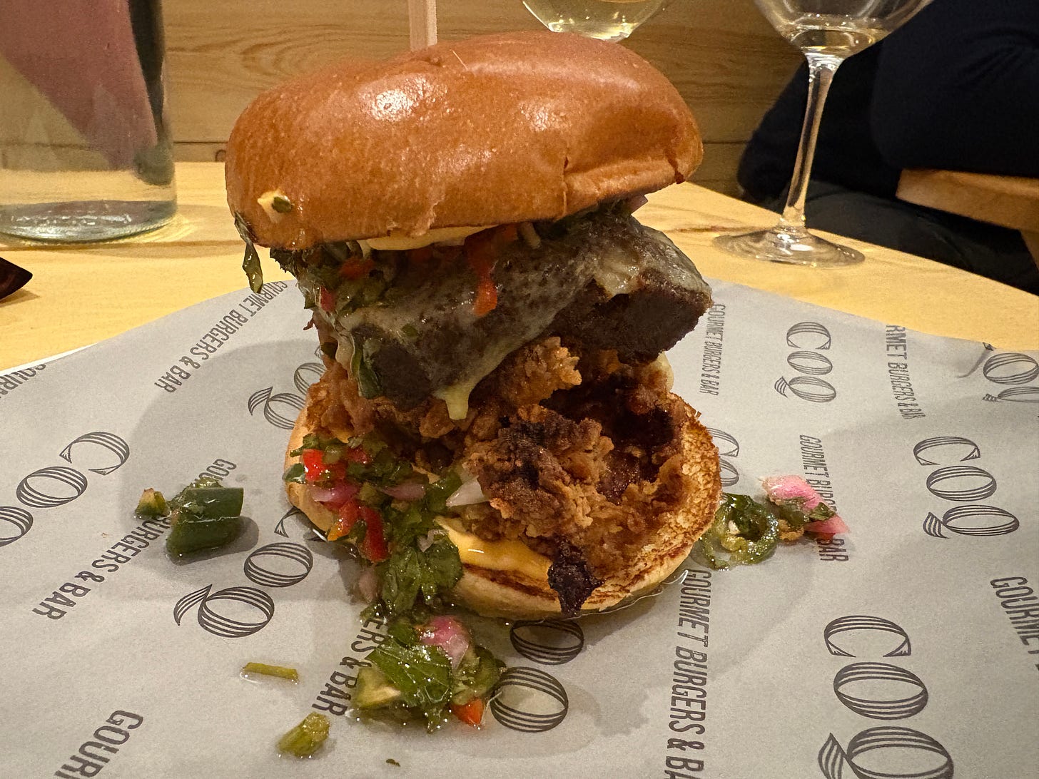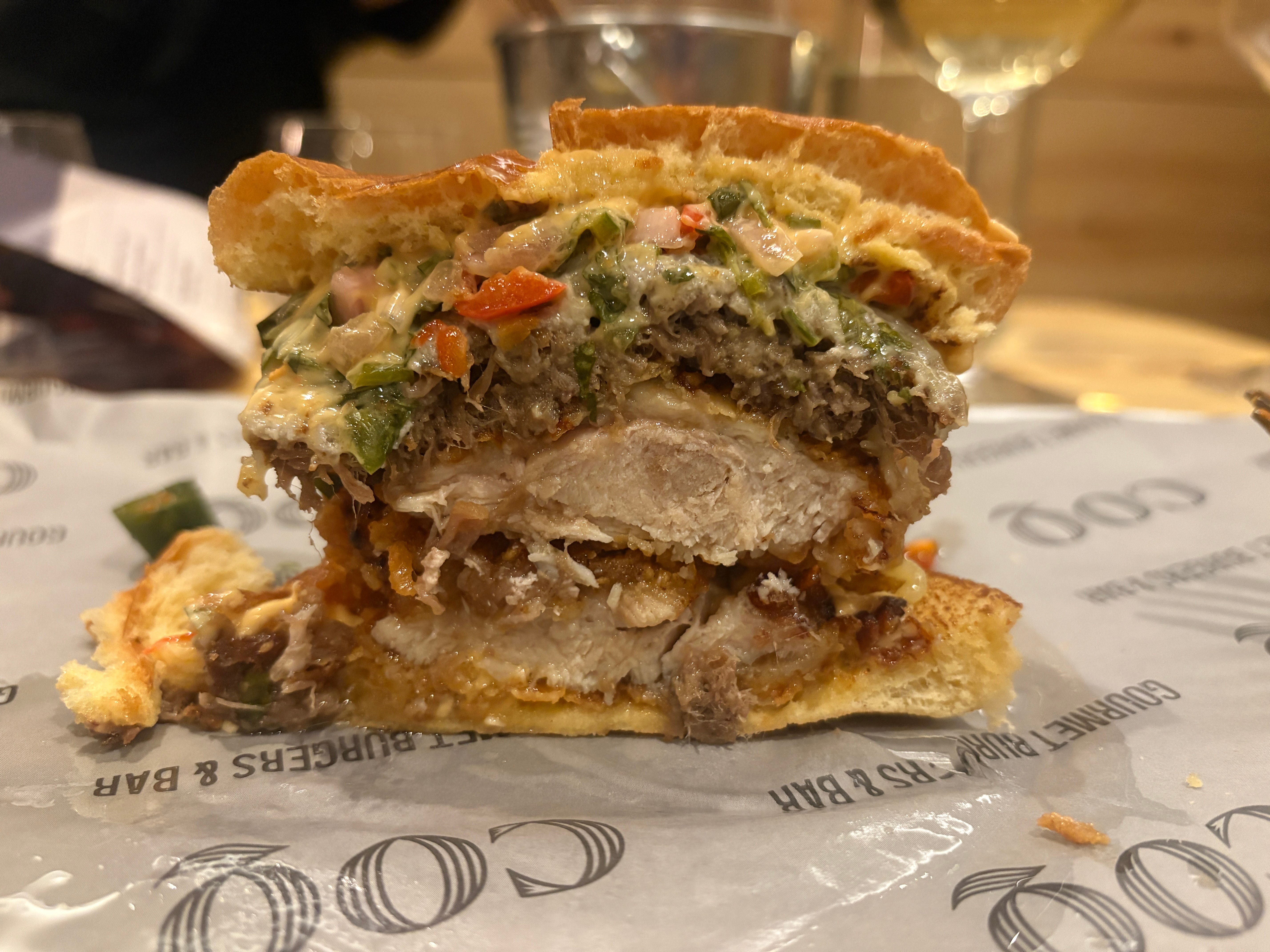 The guacho coq (£16.45) is perhaps a nod to Argentina — topped as it was with braised beef shin, chimichurri, Monterey Jack and… sriracha. It’s the most expensive burger on the menu and the least offensive of the three we tried, though the bottom bun had to be discarded immediately due to total saturation with grease, leaving a half-naked burger which felt very apt.