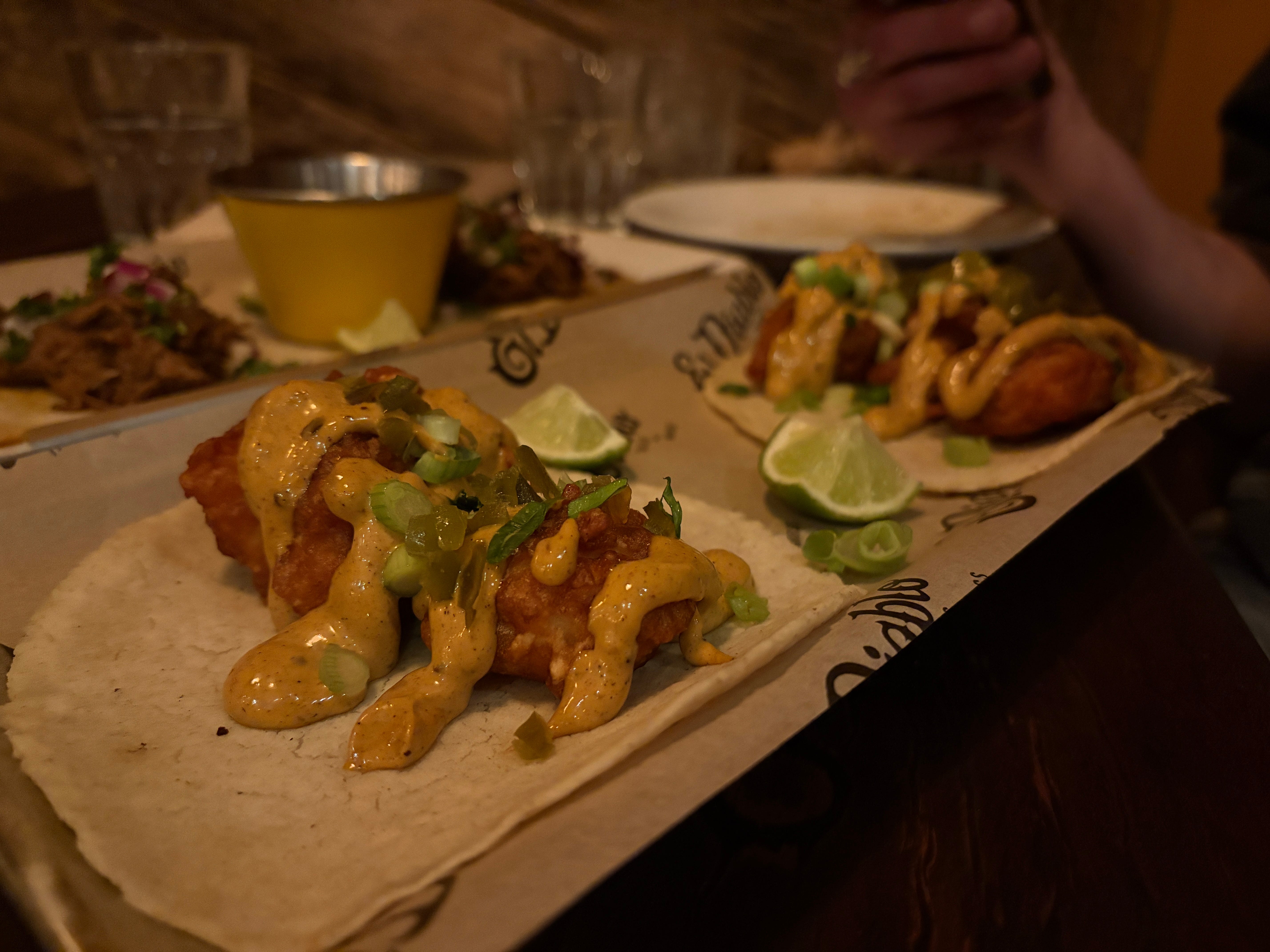 As the noise levels continued to increase, my enjoyment of the dishes went in the opposite direction. Baja fish tacos (2 for £9.5), one of my favourite things to eat and to cook, were drowned in a suspiciously vague and quite unpleasantly bland ‘house Baja sauce’, and were sadly lacking pickled red onions, guacamole or indeed anything else that might have offered some semblance of flavour. The batter was soggy and heavy, probably partially contributing to the collapse of the homemade tortilla underneath the second it was lifted off the tray.