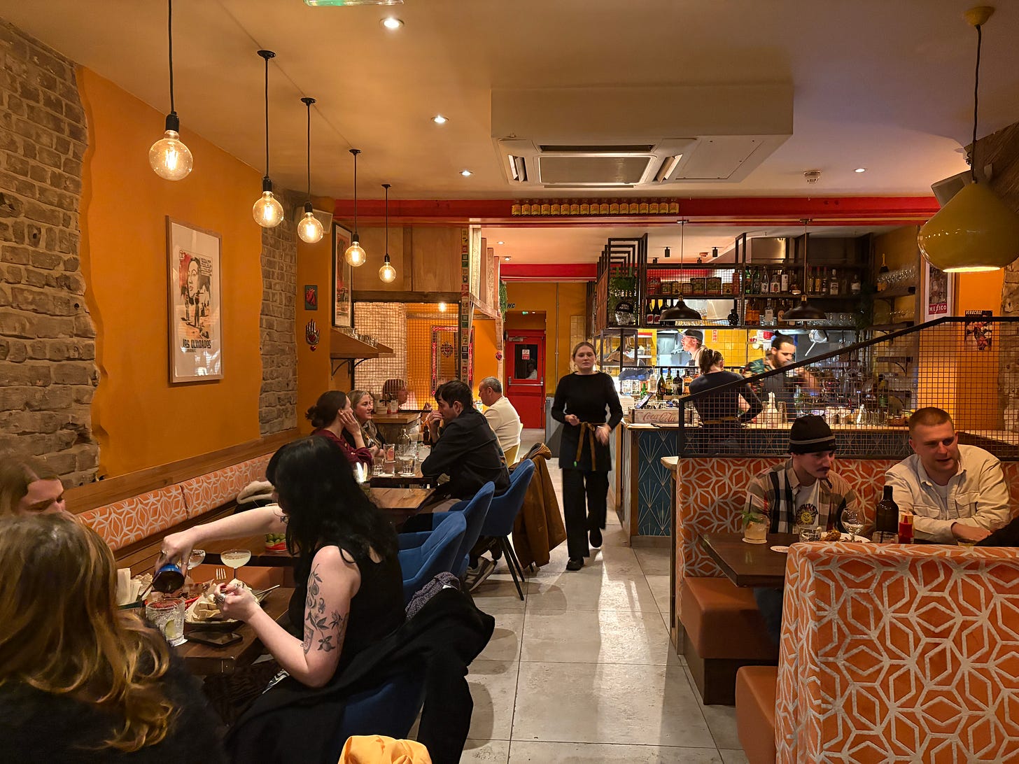 That said - although you probably didn’t hear it - some of the food was good. The nachos (£9), generously loaded with studs of pork carnitas (£4.5 extra), guacamole, salsa and queso fresco, were freshly fried and some of the best I’ve had in this neck of the woods. If we’d left after that and a distinctly unspicy spicy margarita (£11) I would have only had a mild case of tinnitus and a moderately good impression of the restaurant.