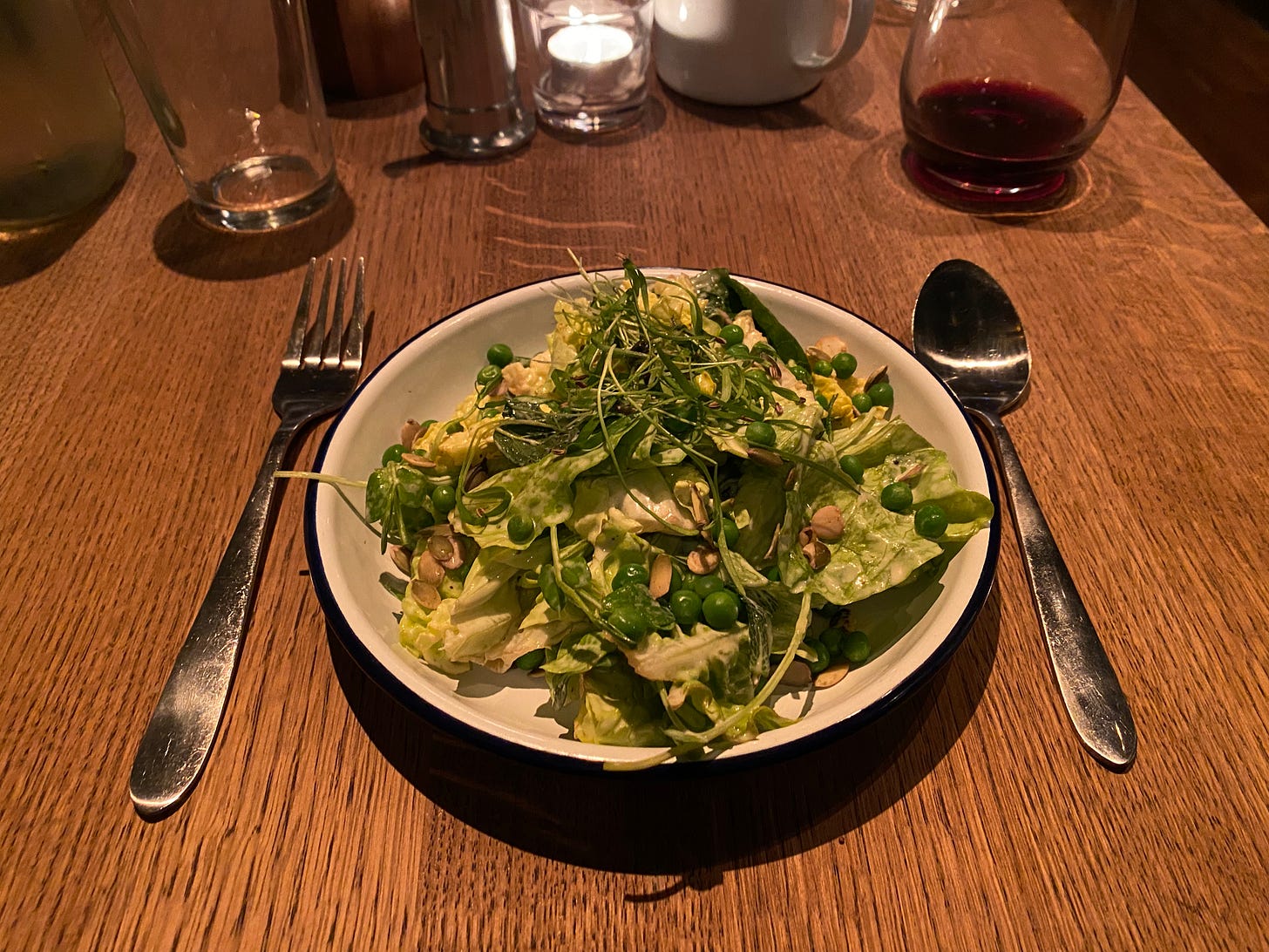 Eaten with a spoon and fork, the salad (£3.50) was very acceptable: lettuce, some herbs, and a few pulses including raw peas, a faintly industrial creamy dressing. The steak was also good, decent size and flavour, cooked as ordered.
