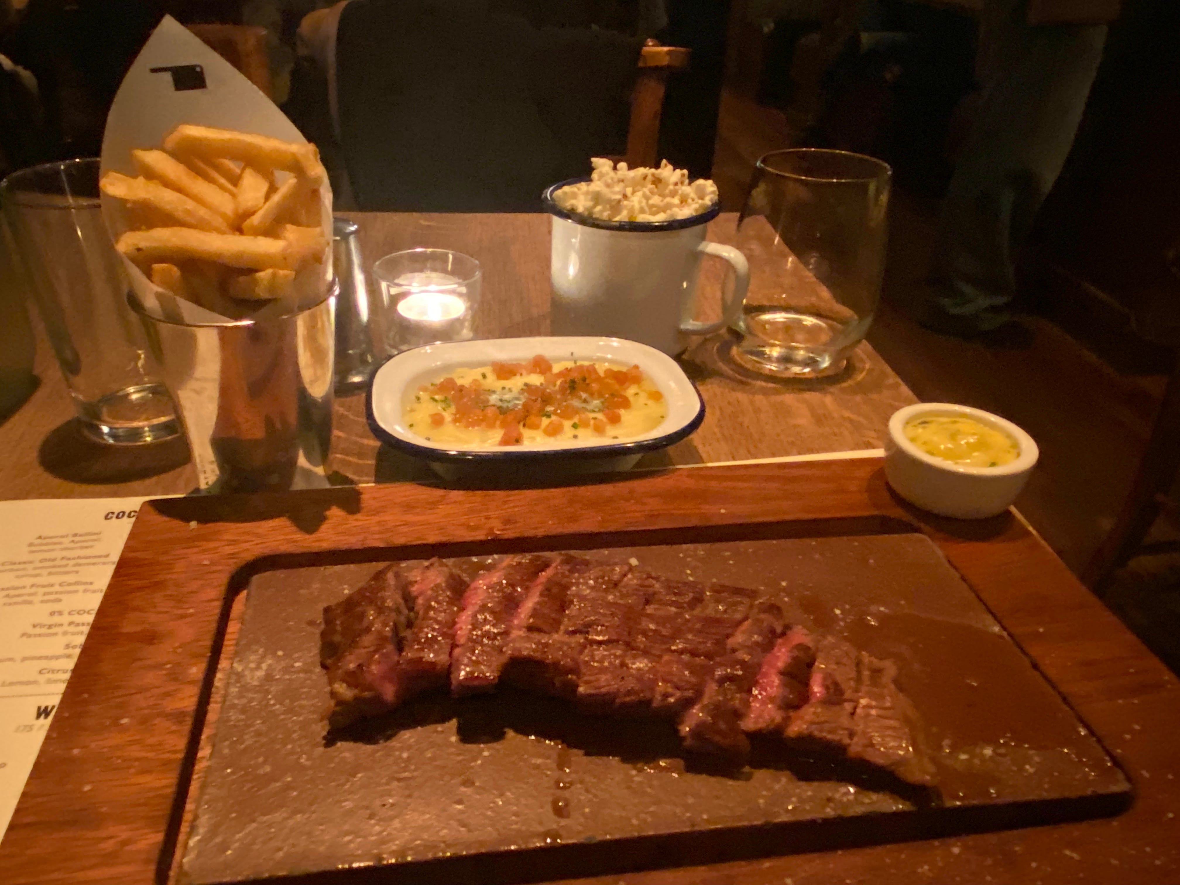 If and when you finish queuing, service is rapid and attentive, if a touch haphazard. Moments after one server had put my dish in front of me, another wandered past, noticed me, and asked how I was enjoying it. “Shall I talk you though the menu?” was the first question when I sat down. A pretty superfluous offer, since there are no starters, no bread, four steak mains, a few sides and a handful each of cocktails, wines, and beers. Each table has a carafe of water and an enamel mug containing what could be either polystyrene packing chips or popcorn, but since I’m about as keen on popcorn as I am on polystyrene I gave it a wide berth.