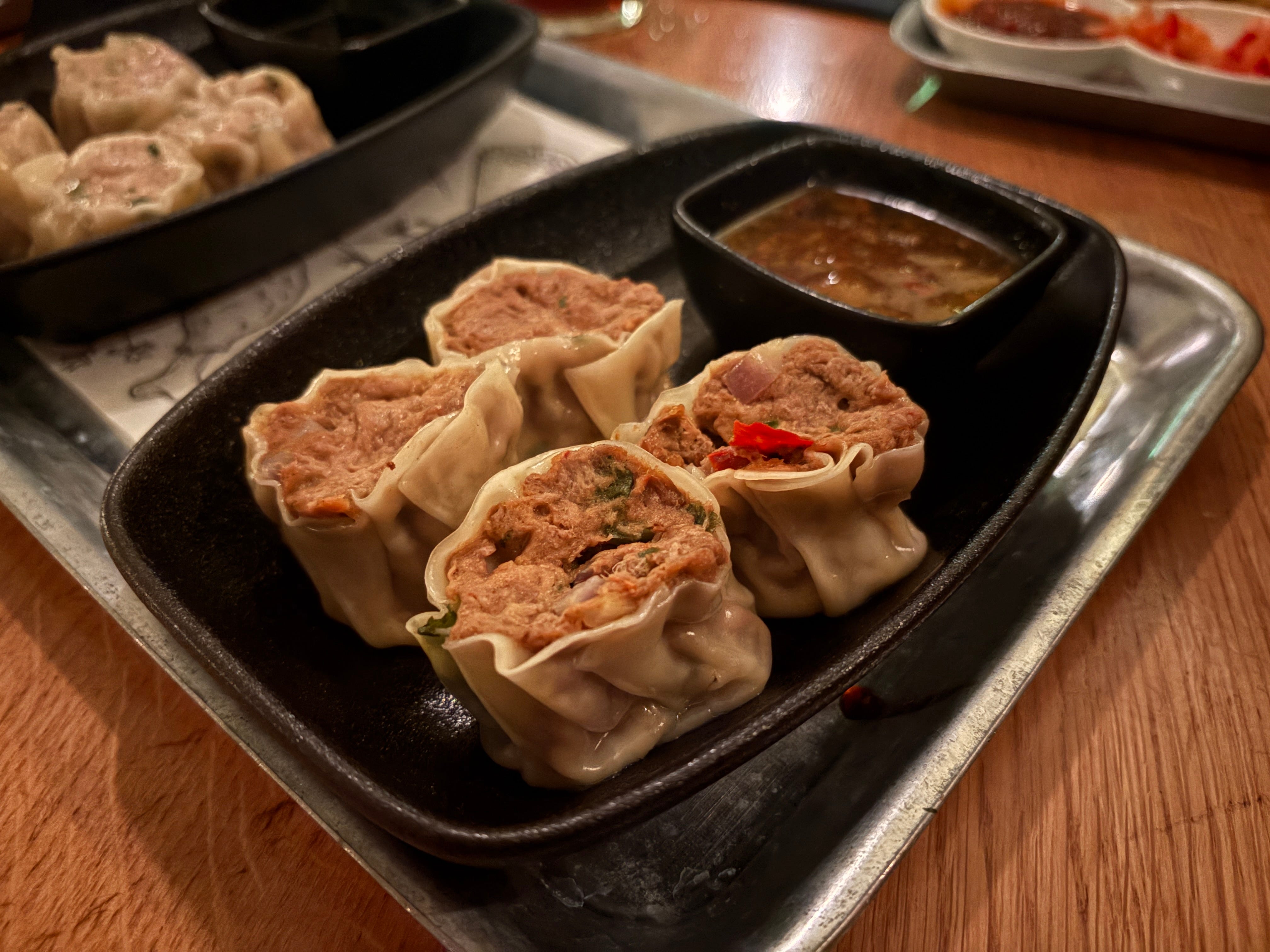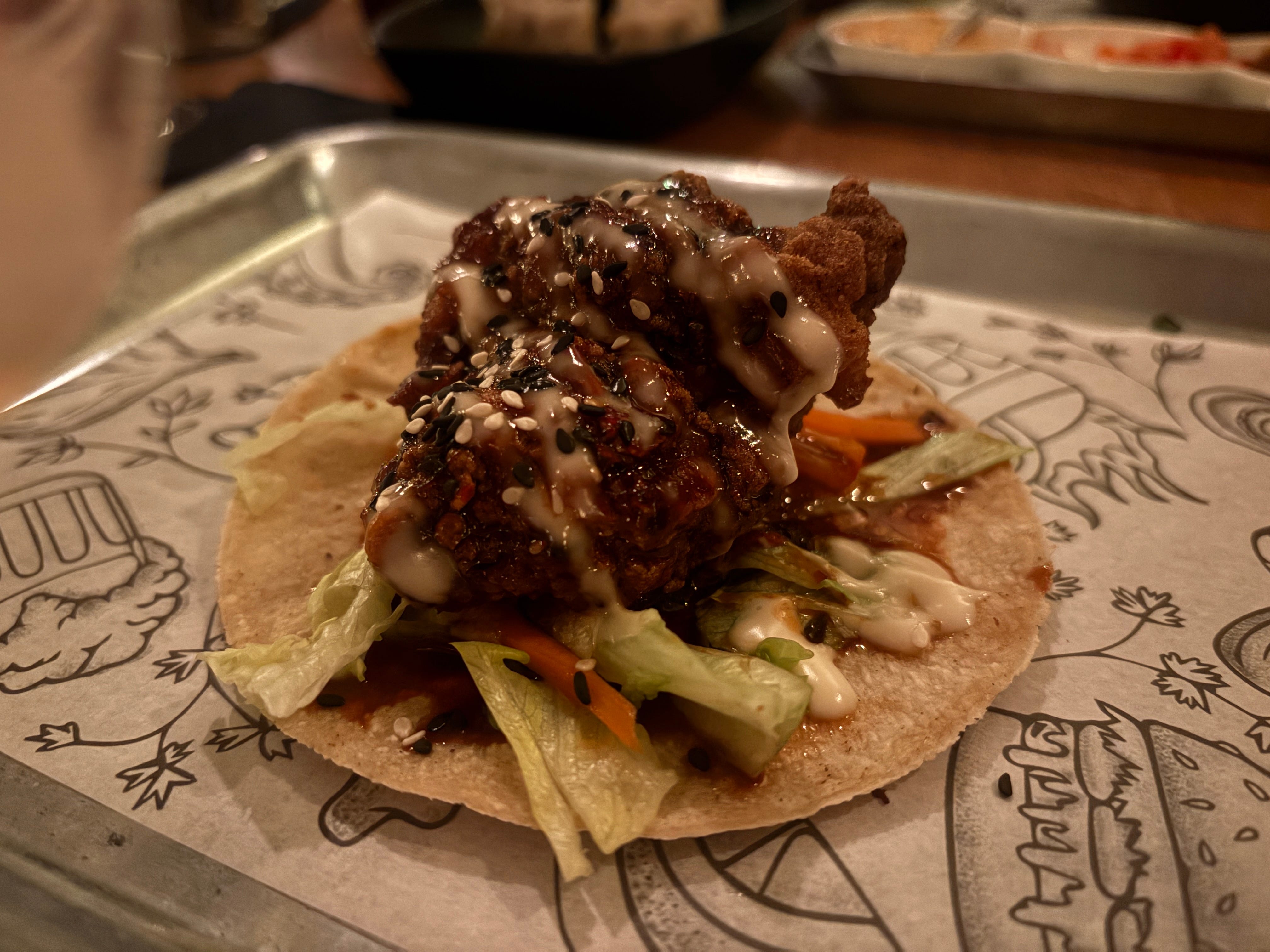 Gourmet Warriors have taken this opportunity to expand far beyond tacos, and beyond even just Mexico and Japan. The menu now reads like a Race Across the World challenge; there’s siu mai (Chinese) stuffed with Thai pork and prawn. There’s a laksa dip (Chinese/Malaysian/Indonesian), sambal matah (Malaysian) and Korean fried chicken, along with the birria tacos and ramen. All of those places produce outrageously good food, but difficult to do them all justice in what is essentially a pub kitchen. It suggests a madcap attempt to capture evasive food zeitgeist rather than a well thought-through menu — but that didn’t stop us hoping for the best and ordering most of it.