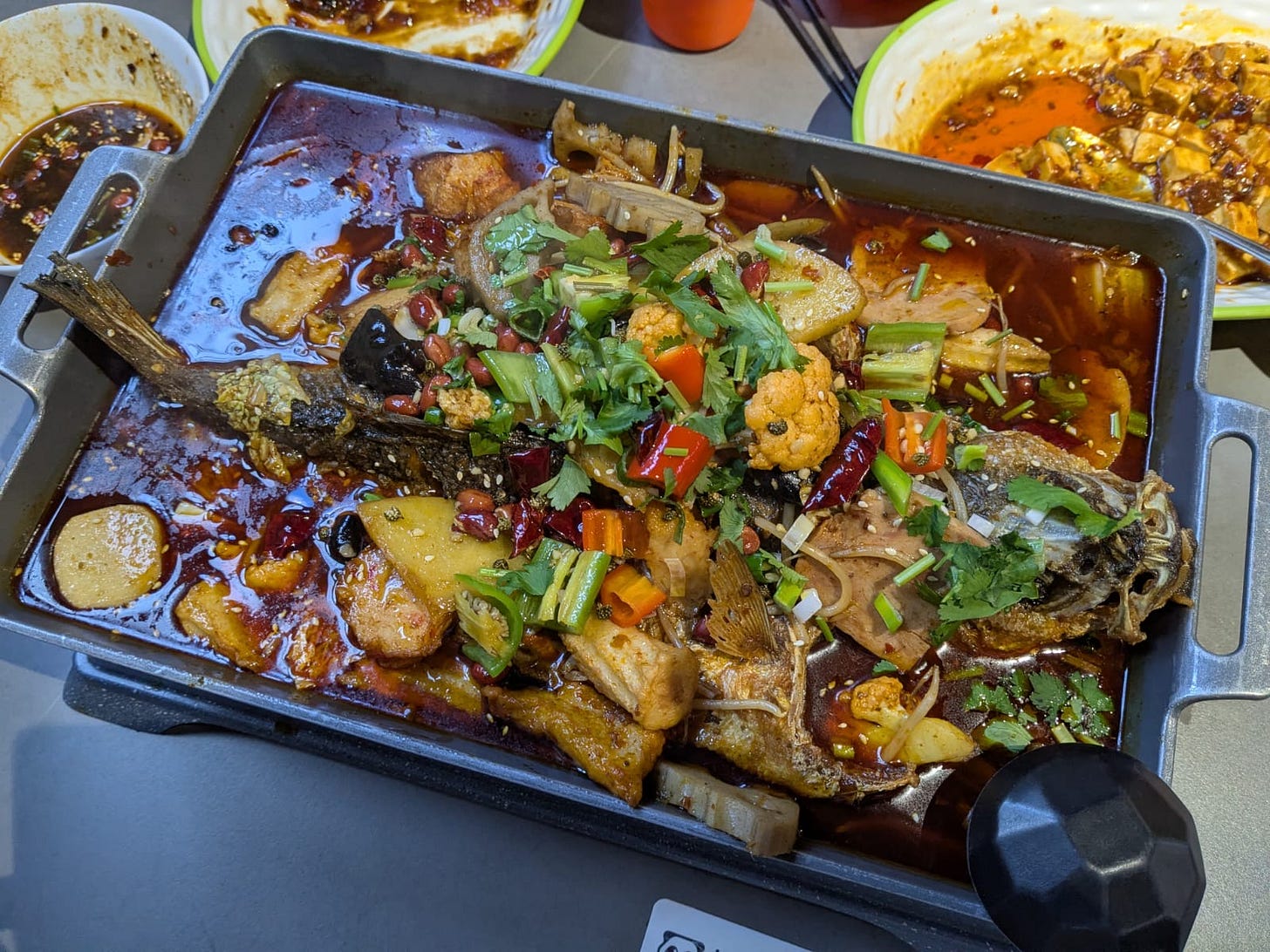 Bad: the grilled fish with hot chilli. The fish itself was fine. A gruesome blighter of a whole sea bass, gurning like an influencer mid-mouthful of yet another “collab” (like Trump just collab-ed with Venezuela). Flakey, moist, slightly crisped at the edges.