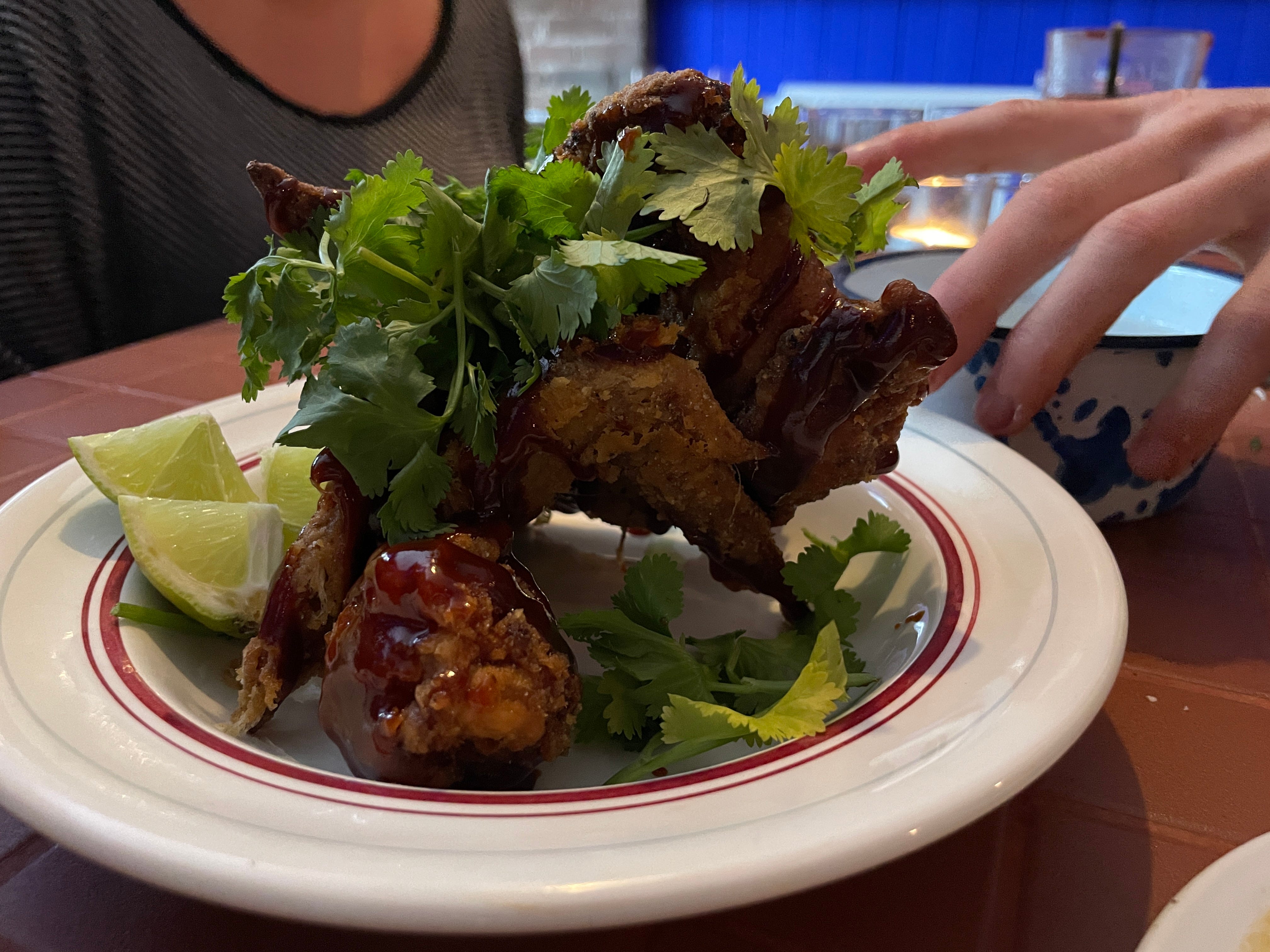 From there the highlights came thick and fast. A tower of crisp and generous chicken wings (£9.3) doused in michelada sauce. Hunks of courgette battered (£7.5) and fried to shattering perfection, ideal for swooping large swathes of tofu ranch. A prawn ceviche (£12) with cucumber and mini tortilla discs was awash with giant sweet prawns just tempered by a citrus sauce so refreshing you could - and we did - drink it.