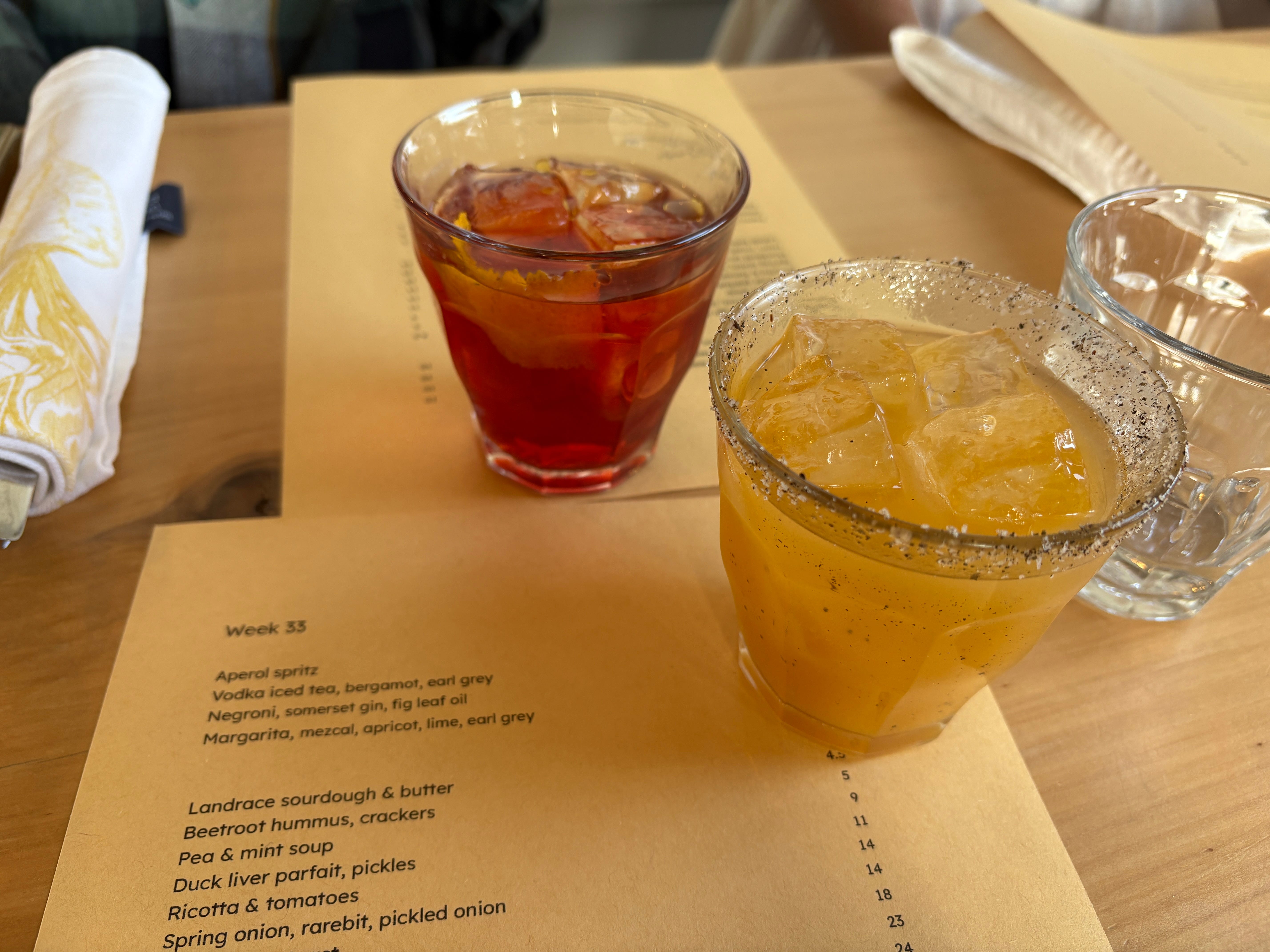 Cocktails mostly had a fruity twist: fig leaf oil in a very good negroni, apricot in the mezcal margarita. The menu, meanwhile, made good use of what could be sourced in and around the farm, littered with peas, beetroot, mint, tomatoes, chard and the like. Beetroot hummus and duck liver parfait were both solid examples of their sort, thankfully metaphorical rather than literal, the former a pleasing magenta hue under its pretty garden scene of flowers and leaves.