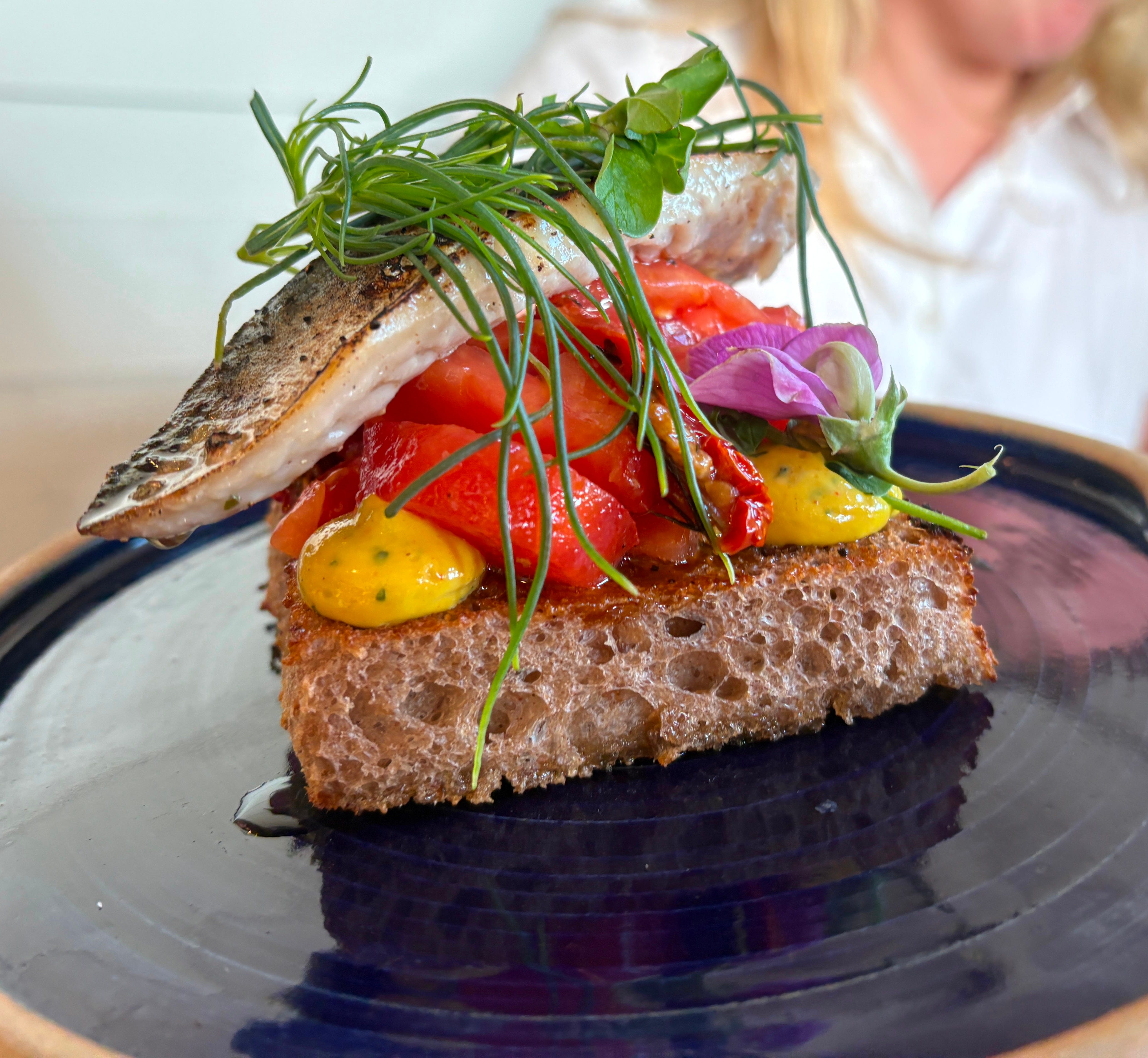 “Mackerel on toast” belied the nuanced complexity of the dish. Although mackerel is obviously a sea fish, eating it at least felt like some sort of retaliation to the earlier unprovoked aggression of his freshwater brethren. Carefully grilled and piled onto toasted sourdough with lightly acidulated, joyously flavoursome tomatoes at the peak of their summer powers, salty sea herbs and bright fuchsia flowers, I laughed as I ate - partly out of revenge, partially due to such purity of flavour and, ironically, face-slapping freshness.