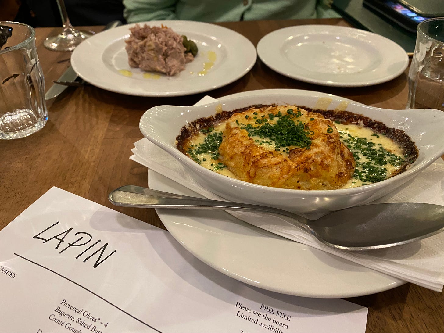 There is Lapin on the menu, in more ways than one. Rabbit isn’t that common anymore even in France, where it was once a staple of family menus. This is the fault, explains Jean-Robert Pitte, author of the Atlas Gastronomique de la France, of the attachement sentimental of les enfants for this little animal so easy to caress. For the adults of Wapping Wharf, however, easy to munch.