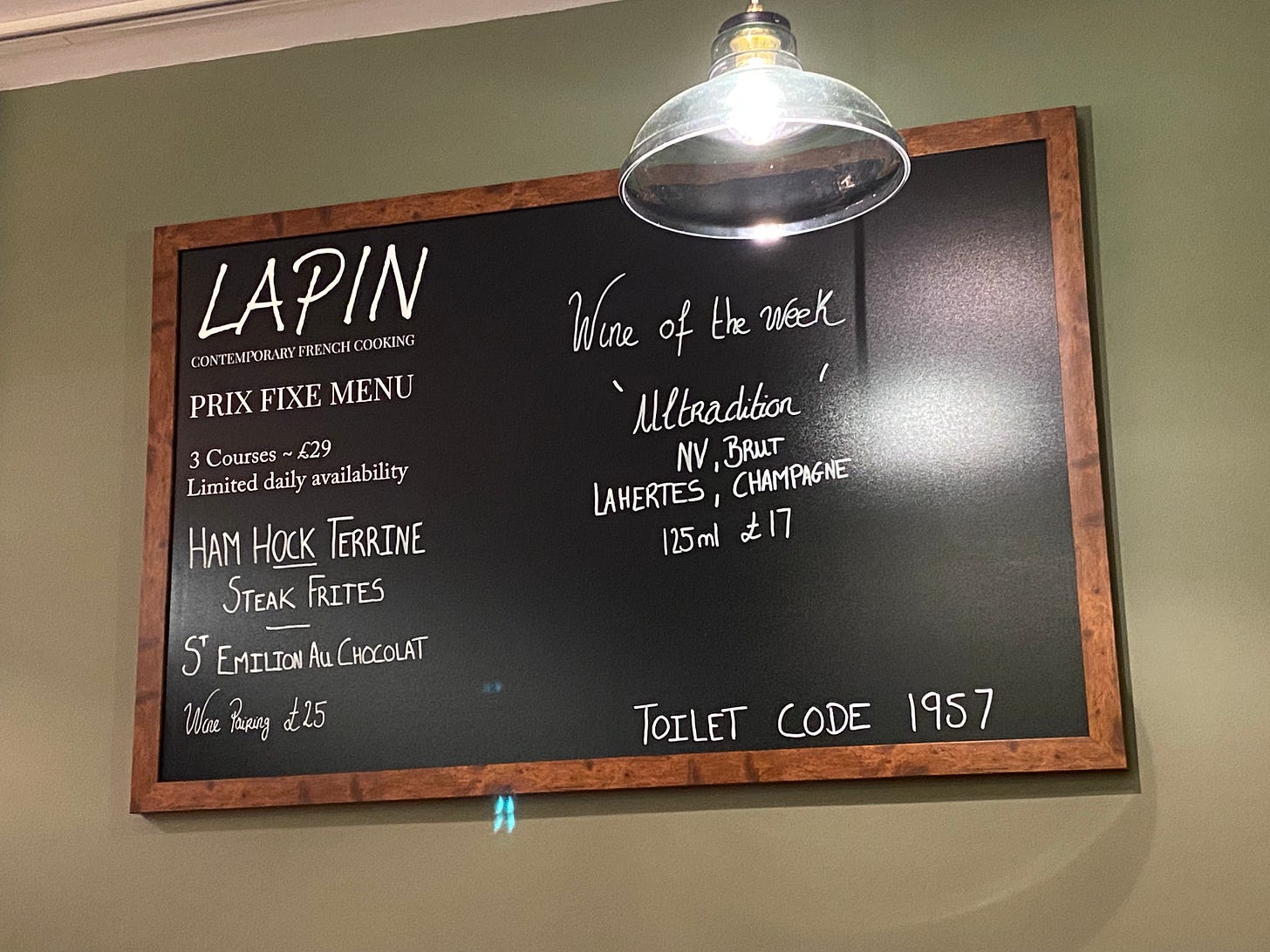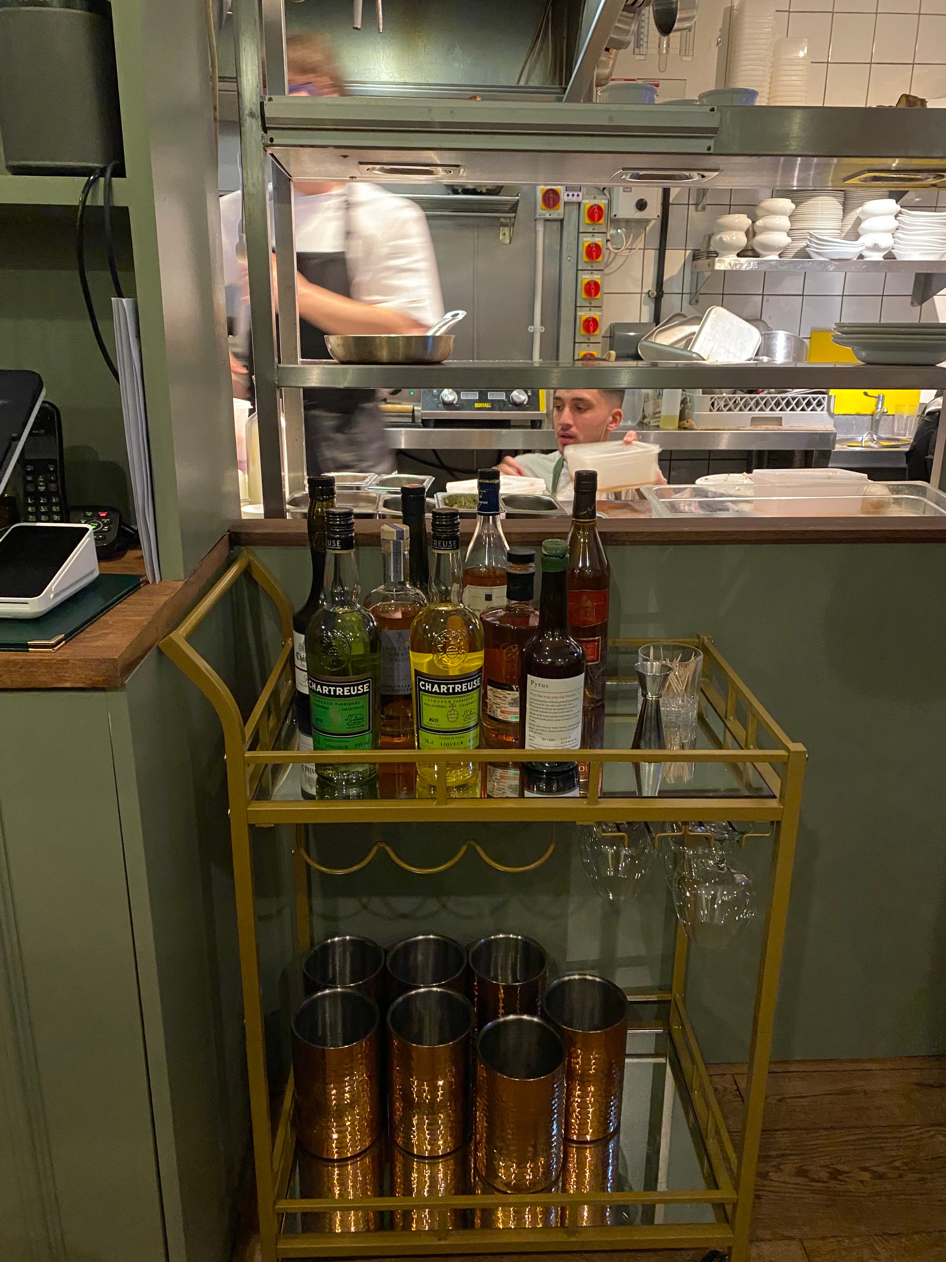Neatly packed into three soldered together Cargo shipping containers in Wapping Wharf, Lapin is small, square, plain but pleasant. It’s well planned, with unadorned sage green walls, overhead lights, a wall of books and bottles, and a nice little vintage cocktail trolley for the digestifs in front of a semi exposed but non-intrusive kitchen.