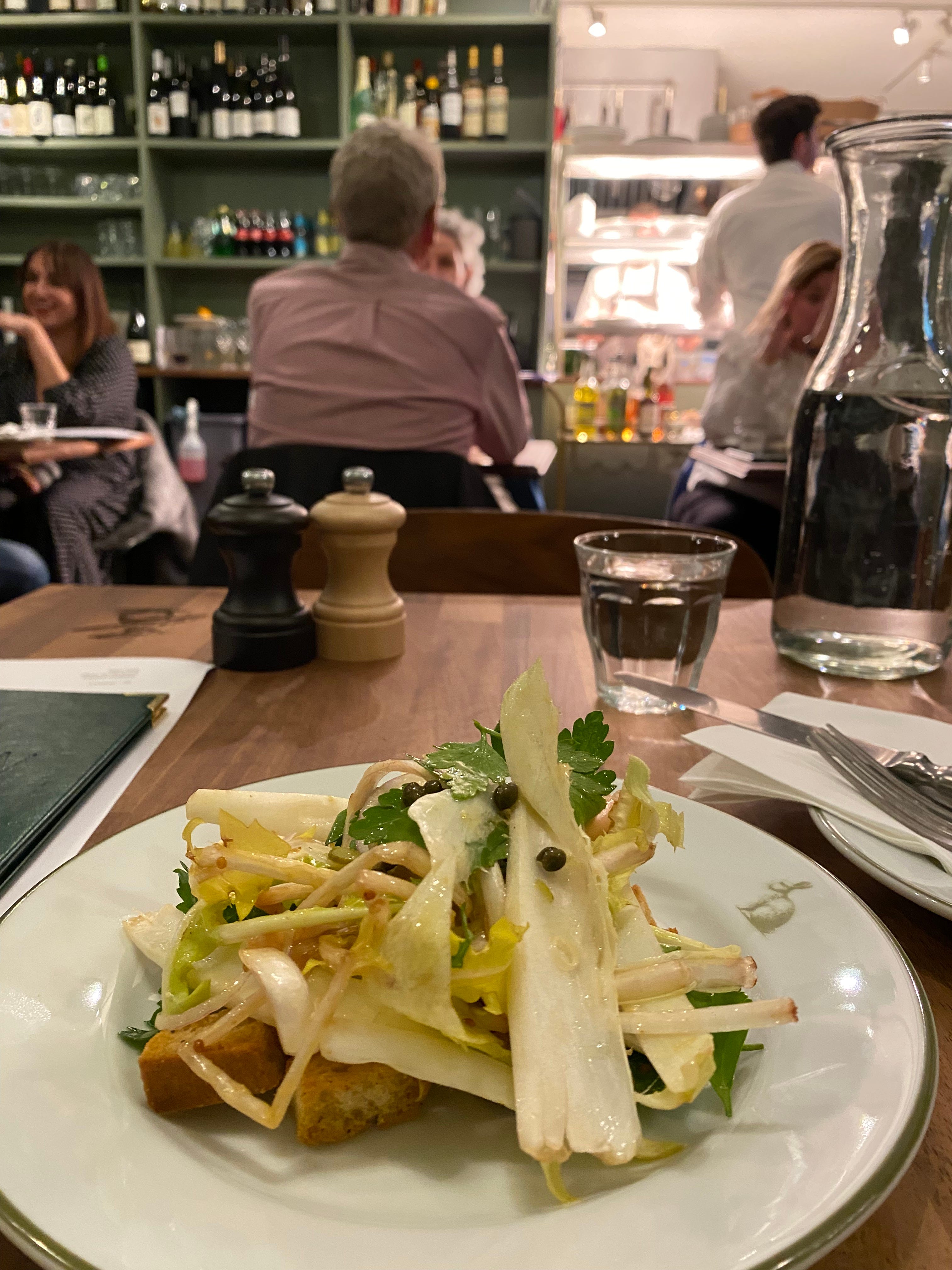 There are a dozen or so tables close together, Paris-style, but not too close. A rabbit motif adorns the tableware, the servers’ old school white cotton jackets, the green leatherette wine list covers, and the bare wooden tables. Shame they didn’t go for paper table cloths. The proprietor and sommelier double as very effective waiters.