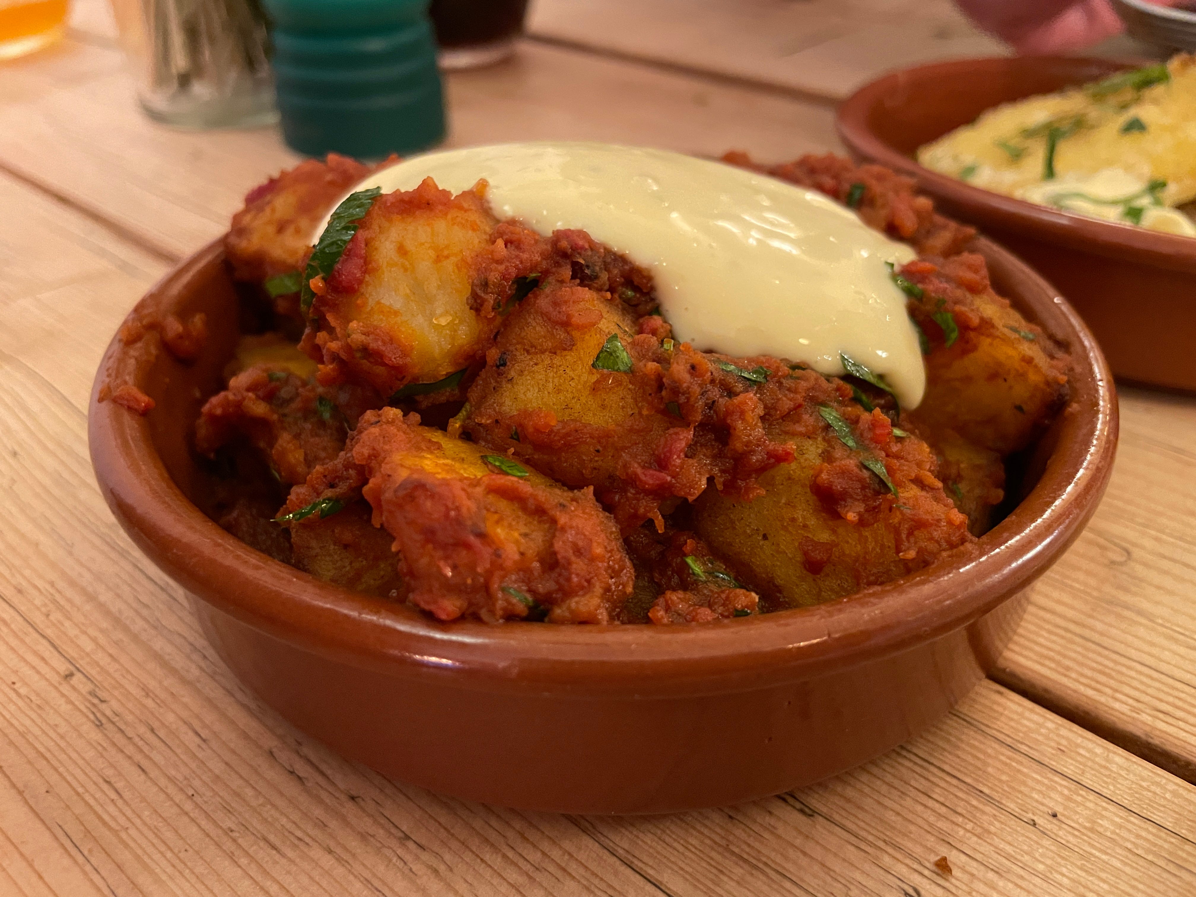 Then they came back with a menu with ticks next to the things the vegetarians/prawn-phobes can eat; patatas bravas has sadly fallen into the dark side. Surely the venn diagram of vegetarians ordering tapas and patatas bravas is a perfect circle; how can you make your patatas bravas not suitable for vegetarians?