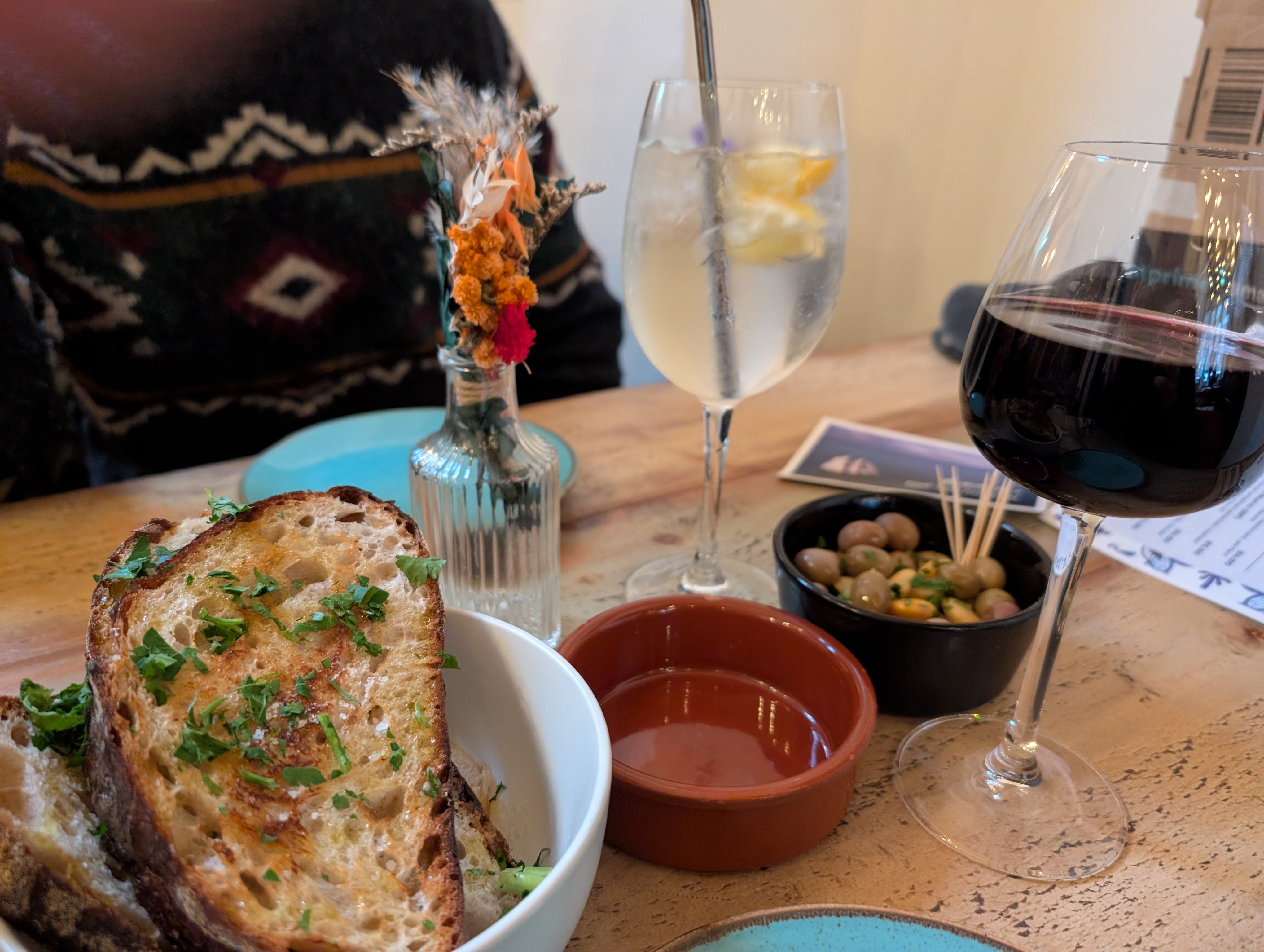 Faintly toasted, the sourdough is lightly drizzled with rich olive oil, herbs and salt. Too lightly for our indulgent mood and a dish of thick olive oil is swiftly brought from the kitchen, with some extra flakes of salt for good measure.