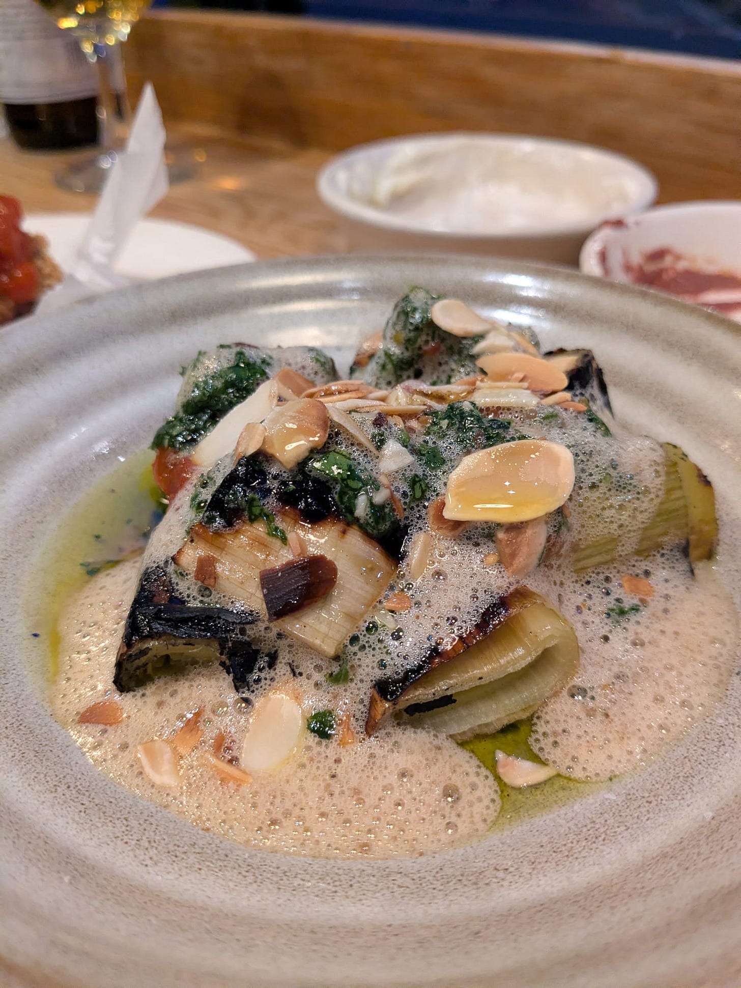 Leeks and mushrooms, fittingly two dishes from the vegetable arsenal (no, not that fan caught eating broccoli at the Emirates) were largely successful, though still with the odd miscalculation. The former arrived as charred, stumpy, slightly stringy lengths blobbed with harissa, salsa verde and some sort of beige, bubbly foam in a let’s-throw-all-the-condiments-at-it-and-see-what-sticks approach that was more pleasing than it sounds.