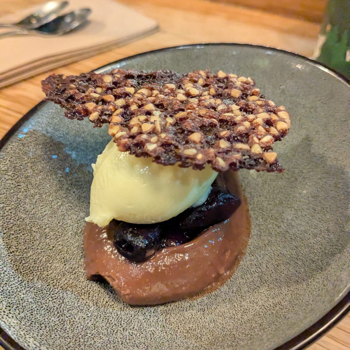 A neat summary of the meal, perhaps, although a surge of terminal lucidity, came in the form of a light ‘dark’ chocolate ganache with ice cream and an almost-jam of sweetened confit Kalamata olives, like salted caramel dialled up to eleven; fruity, sweet, pulpy and moreishly savoury. Olive oil and chocolate is an established pairing these days, but using the flesh is certainly more novel, although I recall The Olive Shed doing just that with a near-identical and similarly successful dessert in 2021.