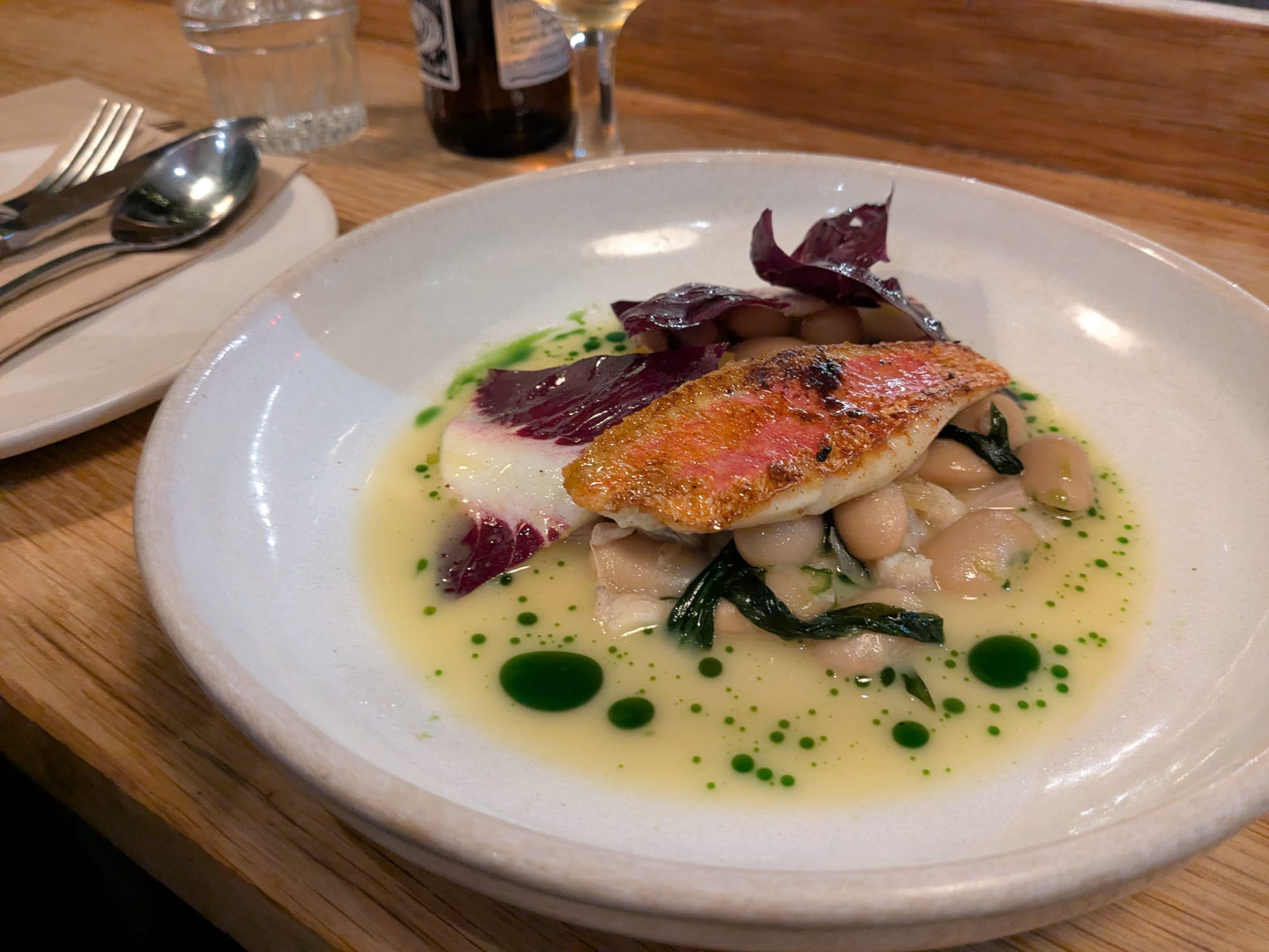 A dish of pork jowl glazed in sherry and served with pommes anna was a clear front-runner on the menu, but had unfortunately been 86ed. Our chosen replacement was a nicely-cooked little red mullet fillet, skin glinting and glimmering, with buttery butter beans draped in wilted ramson leaves and studded with smoked eel and preserved lemon. Nice. A couple of incongruously large and crunchy radicchio leaves were just too bitter to play nicely with the rest of the participants, like a sadomasochist at a teddy bear’s picnic. The soft lines and odd blobs somewhat recalled a Rorschach inkblot, although it’s probably not wise to infer my psychological state.