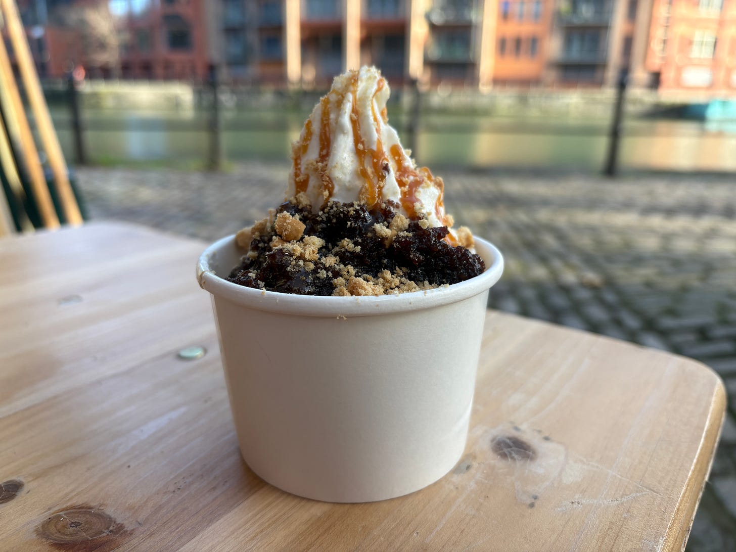 But the real reason I’d come to Soft Buoys was for the eponymous soft serve. You might think a near-zero day in early January would not be the ideal time for eating soft serve outside, but you’d be wrong, because it is always the ideal time to eat soft serve — especially when it’s topped with things like brown butter and sultanas, sticky toffee pudding and brownie with miso caramel and coco pops (all £6).