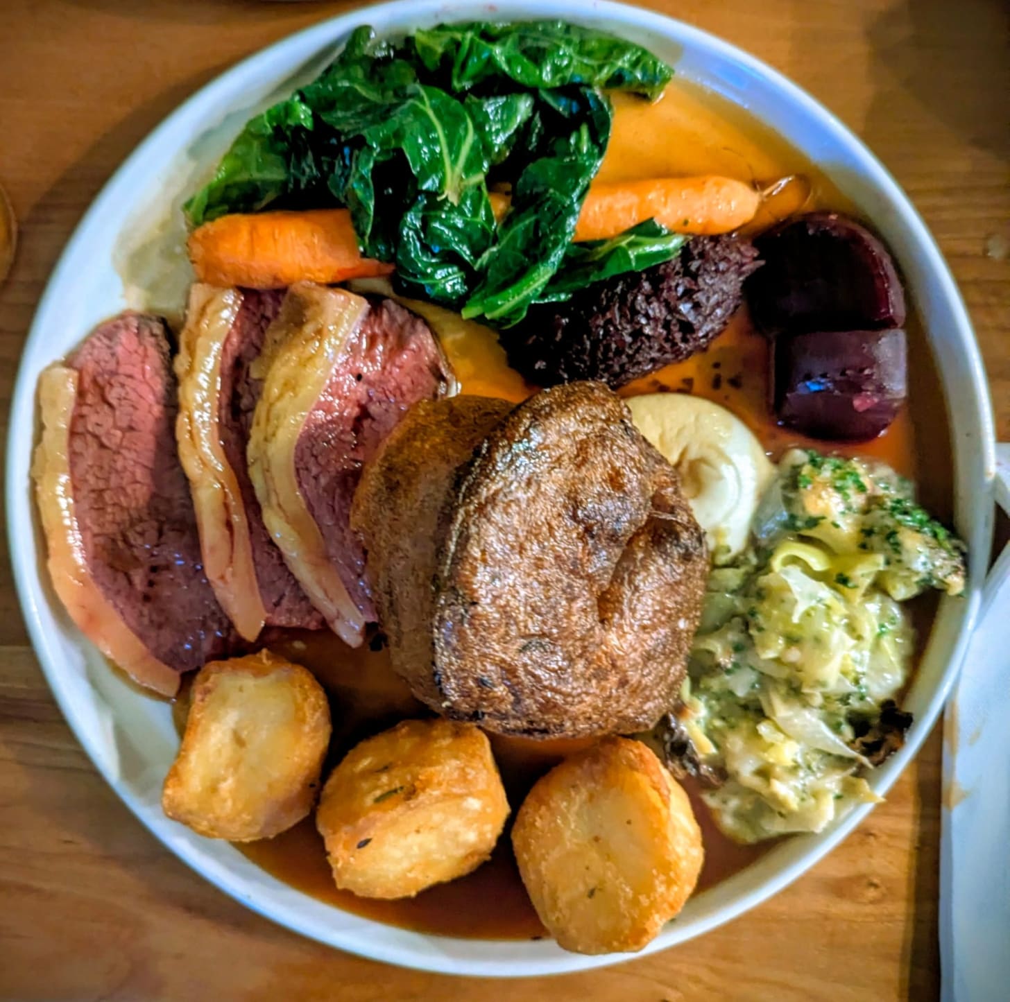 Seasonal greens brought some welcome balance, cutting through the richness of the beef. The cauliflower cheese (£6.95) leans indulgent. Service is also a strong point, staying sharp throughout despite a busy room.