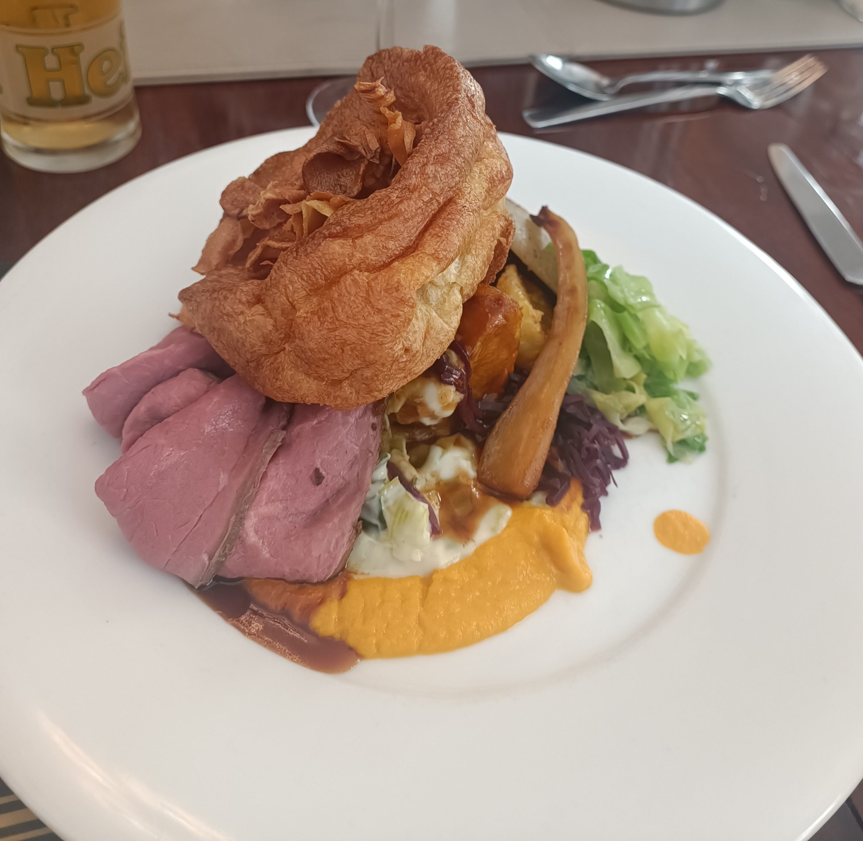 The gravy at The Bank is a standout: a rich, deep, velvety blanket that delivers pure comfort, and the best on this list. The trimmings are just as strong; crispy parsnips, buttery, creamy leeks and a not-too-heavily-spiced(!) braised red cabbage, smooth cauliflower puree, an al-dente roast carrot. Veg isn’t an afterthought here. This was all before I started asking myself why I’d chosen to do this.
