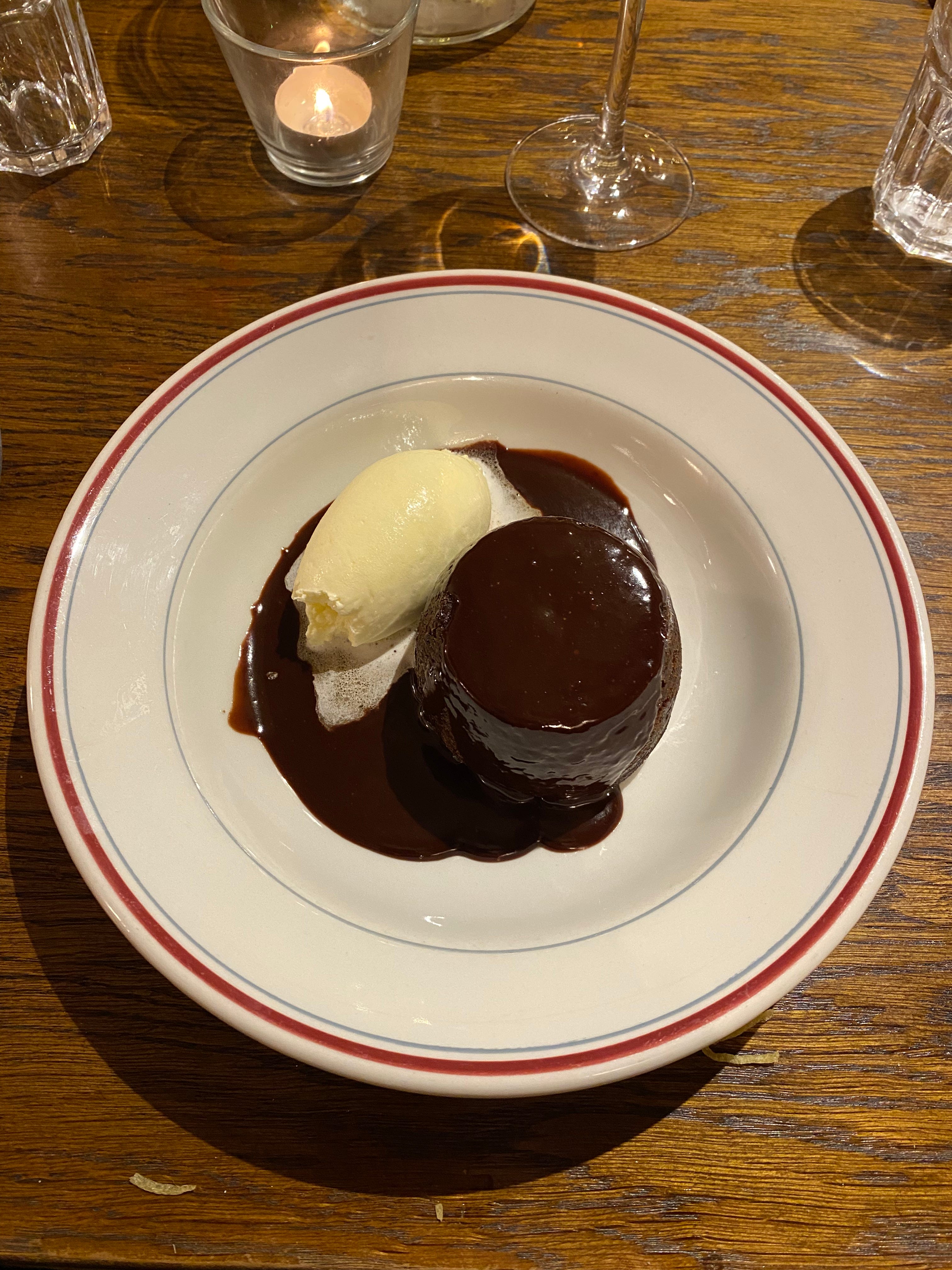As for desserts - trad British is strongly in there, primarily in the form of a voluminous apple crumble (£8). In fact, it’s pushing my luck to say this having already slagged off cockapoodles, but I have a thing against crumbles, even ones sanctioned by Prue Leith. The fact the French have gone bonkers on crumbles makes no difference, they have on muffins too. And bagels. Whatever, the Blaise patisserie department is above minor prejudices like this, and has plenty of excellent alternatives. For example, a magnificent steamed chocolate pudding full of Guinness, prune and walnut with a terrific hot chocolate sauce (£8).