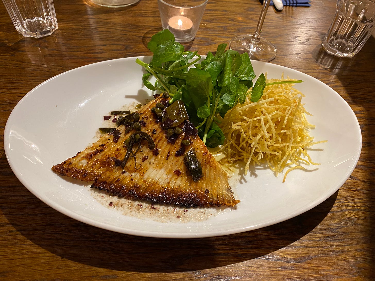 Main courses include a tasty onglet steak with good chips and piquant salsa verde (£22) and a bacon chop - an unusual cut - with sweet potato rösti and a frisky pineapple and chilli sauce (£19). The fish is excellent, too, for a non specialist fish restaurant, recently a superb plump wing of skate (£23) with capers in seaweed butter, garnished with straw potatoes and most discreetly impressive touch of all, a small salad of fresh, no, make that dew-fresh, watercress in a perfectly light and subtle vinaigrette dressing.