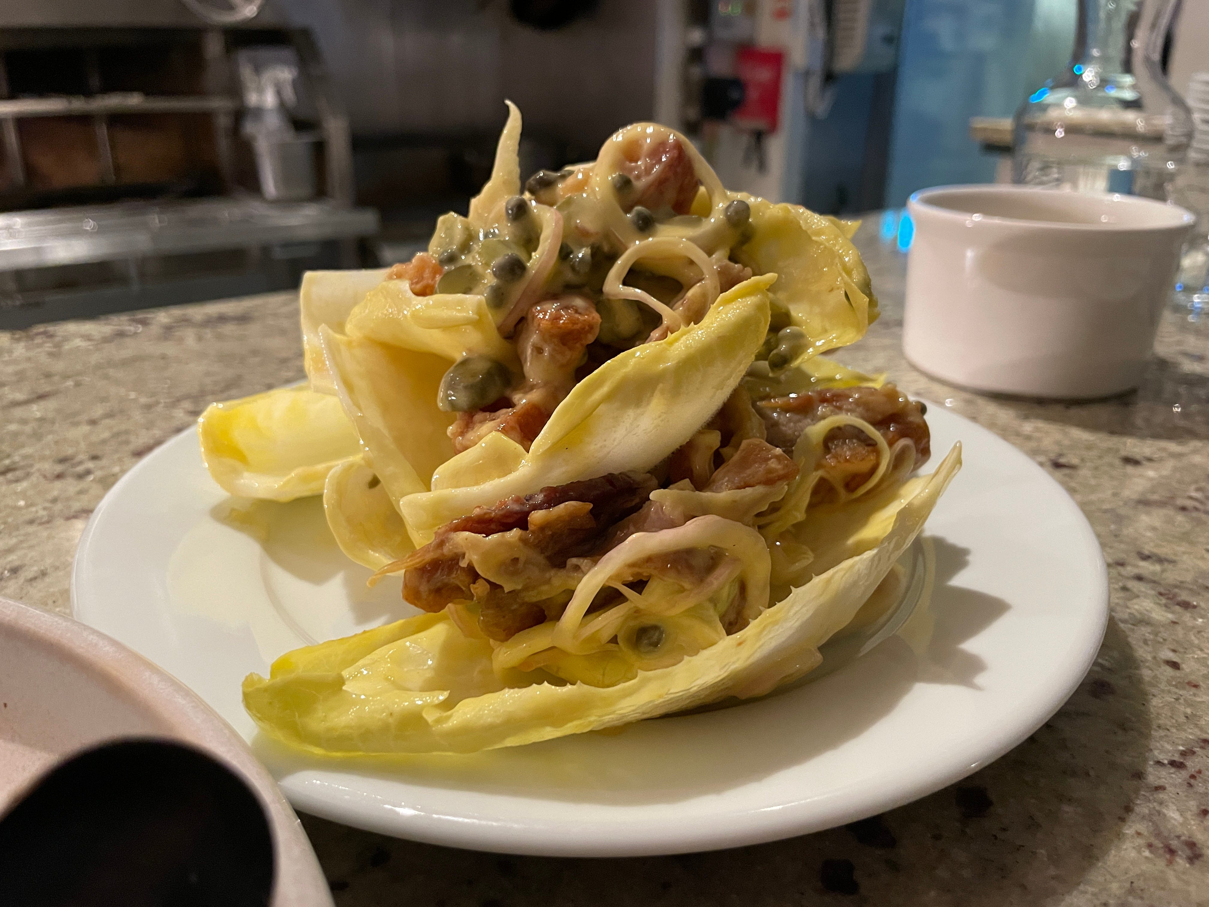 Crispy pig cheek with fennel, chicory and mustard (£11) was a lesson in rendering fat to make the crispest, teeth-tacking pork you’ll ever eat. If all crackling was this good we probably wouldn’t feel the need to eat anything else. Cut through with sharply mustardy chicory, fennel and capers it was a truly commendable creation.