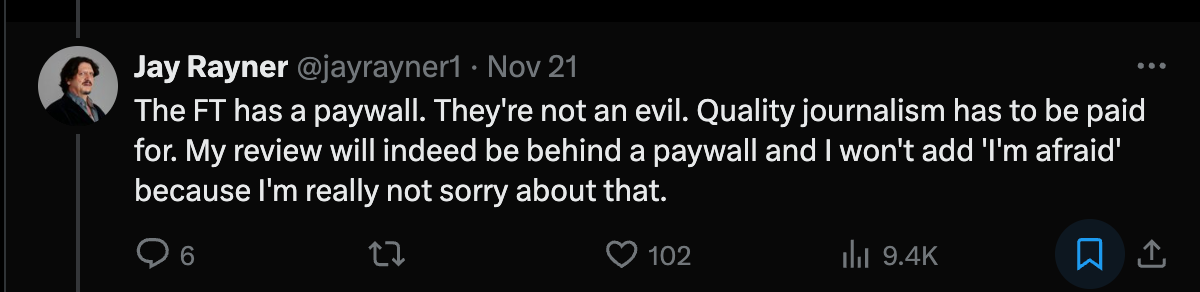 Superb review and that's now on my "avoid at all costs" list. Speaking of costs though, while I agree that journalism needs to be paid for, I really can't justify £39 a month for the FT so I'm either going to have to forgo Jay's writing or see if the local library gets a daily copy and try and read it there...