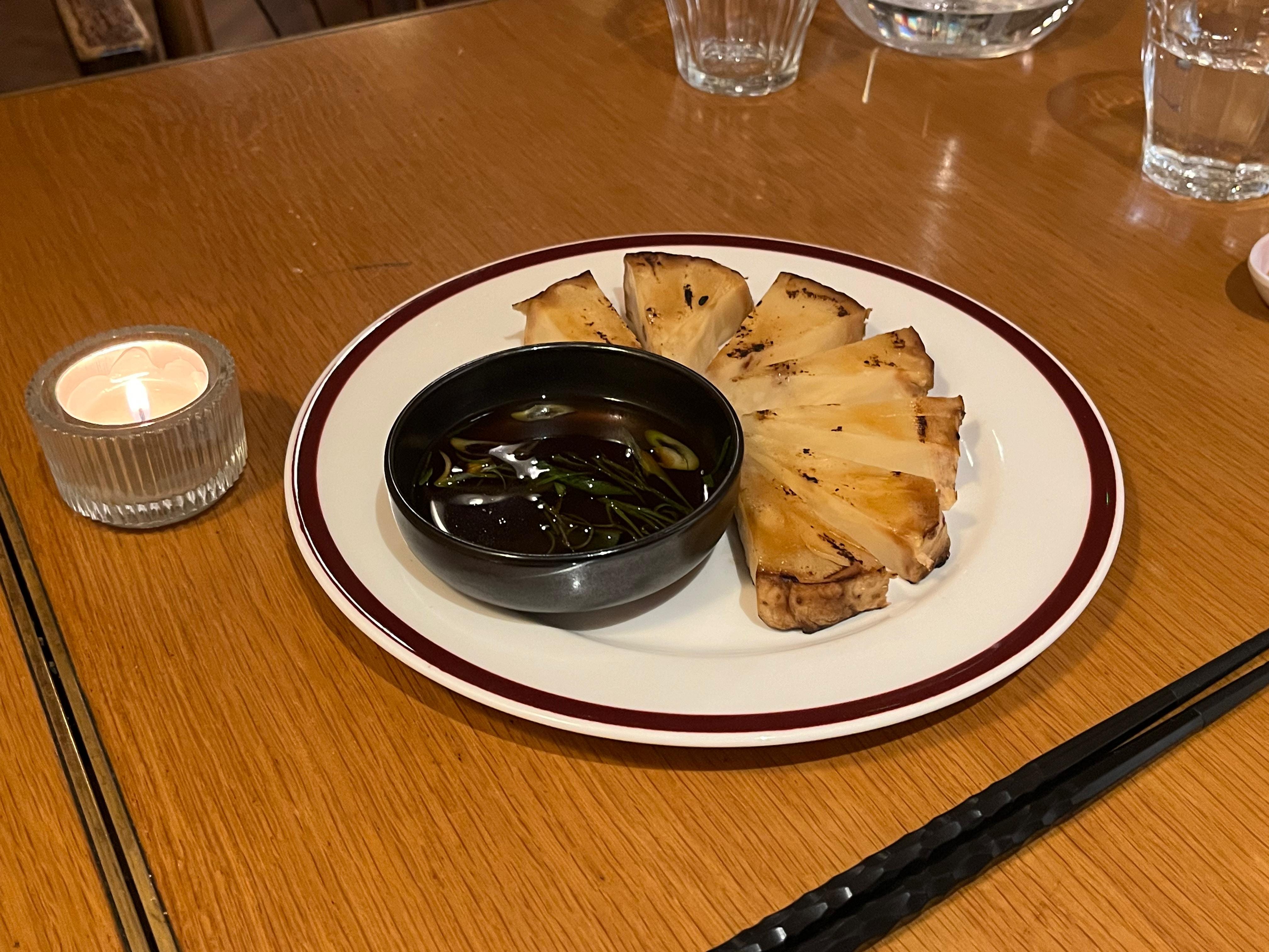 For sides we order zingy smashed cucumber with spicy sesame (£5), yasai gyoza with hints of clove (£8.50), and shio koji-baked celeriac and ponzu (£5) served with ‘sharp dipping sauce’ which I’m pretty sure is just soy. Nice though, and I’ll add to the Sauce’s penchant for loving celeriac by saying this dish is one of the best examples of the vegetable I’ve ever had. Soft and pleasantly similar to parsnip. Our cocktails are divine: umeshu negroni with sake (£9) and a fragrant yuzu bellini (£10), well-executed twists on the Western originals.