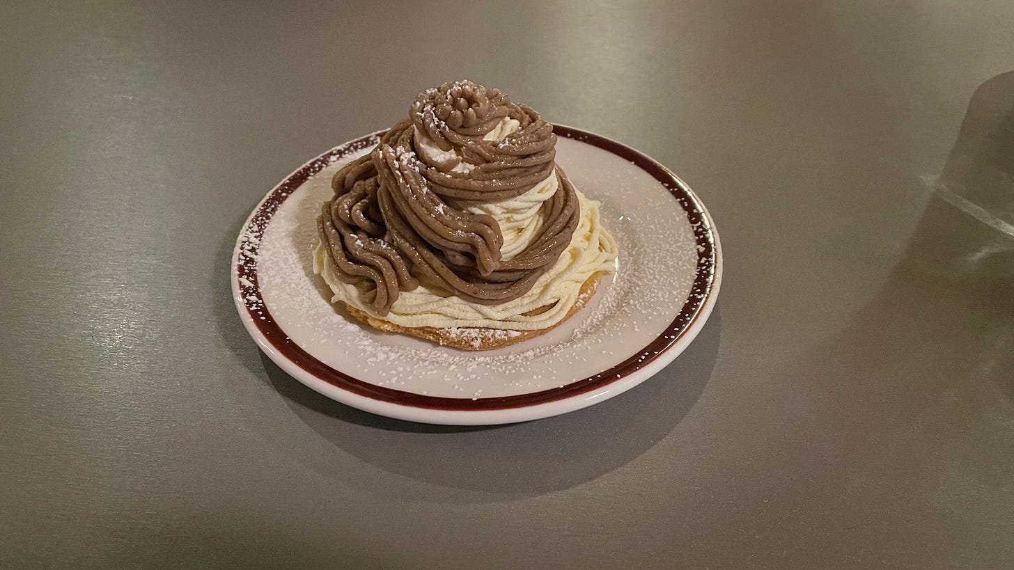 As seems to be tradition for me after a big bowl of ramen, we take to the (metaphorical) hills; mont blanc (£6), extravagant and chock-full of meringue, biscuit, cream, and caramel that is an unfortunate grey colour thanks to the use of miso, but this gives it a good savoury edge. The summit and apex is the chocolate mousse (£6). A cornucopia of flavours, stuffed with cherry compote and shot through with orange juice and cinnamon - it tastes of Christmas. Intense without being overwhelming, interesting with being distracting. Actually, writing that down, that doesn’t sound like such an apt description of Christmas at all.